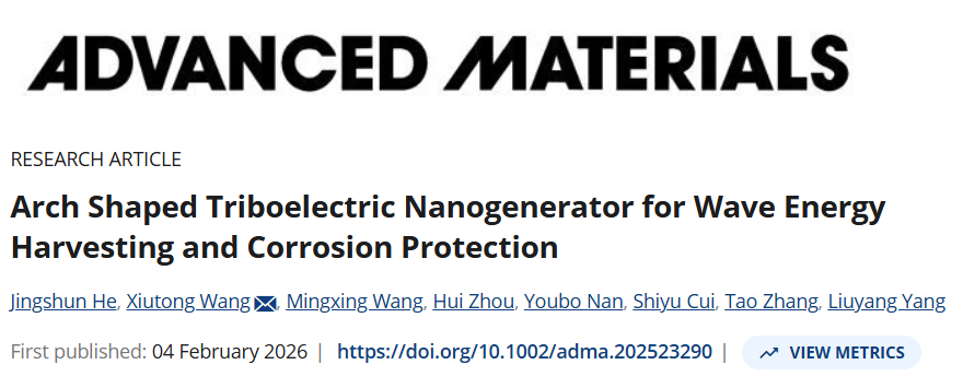文章信息 Advanced Materials Arch Shaped Triboelectric Nanogenerator for Wave Energy Harvesting and Corrosion Protection. Jingshun He, Xiutong Wang*, Mingxing Wang, Hui Zhou, Youbo Nan, Shiyu Cui, Tao Zhang, Liuyang Yang. Advanced Materials, 2026; 0:e23290 https://doi.org/10.1002/adma.202523290