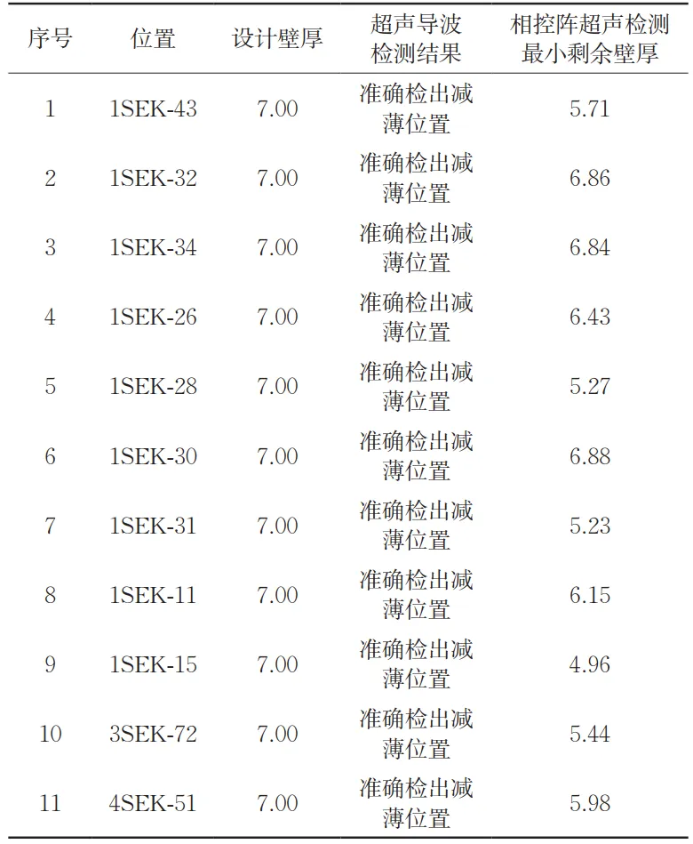 检测对象为某核电厂SEK系统衬塑管道。检测设备包括压电陶瓷低频超声导波检测系统和超声相控阵检测系统两套设备。 压电陶瓷低频超声导波检测系统包括低频导波探伤仪主机、压电陶瓷探头、电缆连接线,打气筒以及电脑。相控阵超声检测系统包括相控阵超声探伤仪主机、编码器,连接线以及探头。 压电陶瓷低频超声导波检测系统作为大面积检测手段,发现缺陷信号后,对缺陷信号进行定位,然后使用相控阵超声检测进行验证,判断实际壁厚,分析减薄趋势,通过验证结果判断管道基体的腐蚀状态,从而间接判断衬塑的基本状态。 衬塑管道基本情况 核电厂SEK系统衬塑管道,设计寿命为60年,工作介质为放射性废水(低放射性),最高工作压力为0.4 MPa,最高工作温度为60 ℃。管道公称直径为250 mm,壁厚为7 mm,每根管长约8 m,管道之间用法兰进行连接,共计长度约1200 m,管道材料为碳钢,管道要求最小允许壁厚为5 mm。 检测结果及分析 对整个SEK系统衬塑管道进行检测,发现11处异常位置,检测结果如图2所示,信息汇总如表1所示。 图2 现场管道1SEK-15位置处检测结果 表1 某SEK衬塑管道检测结果汇总(mm) 由超声导波检测结果可知,检测结果中需关注的特征信号共4个,即特征信号−F2、−F1、+F1及+F2(正负表示方向),−F2、−F1和+F1与管道结构特征(法兰、支撑及焊缝)相吻合,但+F2法兰信号幅值过低,探头与法兰间无明显使导波信号衰减的管道特征,判断探头至法兰间可能发生大面积腐蚀。 由相控阵超声检测结果可知,管道腐蚀为局部腐蚀,腐蚀形貌呈坑状,剩余壁厚最小值为4.96 mm,腐蚀减薄29.1%,腐蚀区域尺寸约为70 mm×45 mm,黑色区域是因管道表面凹凸不平,相控阵超声探头未与管道完全耦合的结果。 根据核电厂要求,管道的最小允许壁厚为5 mm,缺陷壁厚最小值小于最小允许壁厚,故需要对该管道进行评估或维修更换。