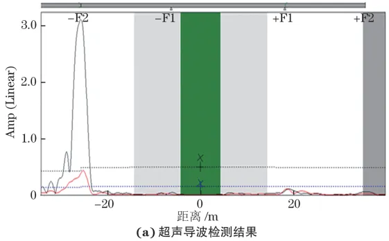 超声导波检测仪器没有相关标准及标定方法,此次标定选用已标定的样管进行试验。样管材料为碳钢,基本信息如下: 作为标准试块测试仪器的状态 长度4 m,直径219 mm,厚度6 mm 缺陷类型:环向沟槽8个 最小环向沟槽:5 mm×2 mm 作为标准试块测试仪器的性能、检测灵敏度 长度26 m,直径219 mm,厚度6 mm 缺陷类型:环向沟槽8个,平底孔8个 最小环向沟槽:5 mm×1 mm 最小平底孔:φ20 mm×1 mm 选用型号为Wavemaker G4的压电陶瓷低频超声导波检测仪,选用直径为8 in的探头,分别在样管1和样管2上进行仪器状态测试,结果如图1所示,可见仪器状态良好。 图1 仪器性能测试结果(F1,F2等表示特征信号) Wavemaker G4型压电陶瓷低频超声导波检测仪可以检出横向环向刻槽(样管1)、横向环向刻槽(样管2)、平底孔1(样管2)、平底孔2(样管2,焊接封堵)、平底孔3(样管2,焊接封堵),轴向距离误差分别为2.9%,3.5%,2.5%,1.7%,3.1%。可知在φ219 mm×6 mm的碳钢管道上可检出的最小缺陷尺寸为φ20 mm×1 mm的平底孔和5 mm×1 mm的环向沟槽,环向沟槽的距离误差最大为3.5%,平底孔的距离误差最大为3.1%。
