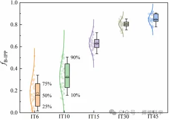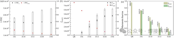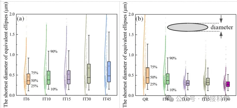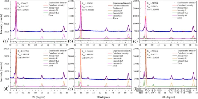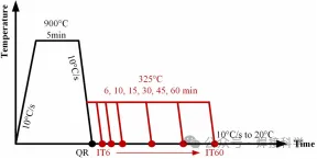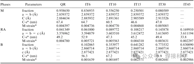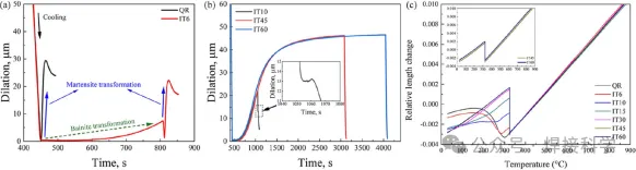 图2 (a) 展示拉伸曲线分析示意图;(b) 拉伸试样的光学显微镜图像(OM);(c) 通过Image-pro-plus处理的高对比度光学显微镜图像(黑色区域:B;白色区域:M + RA)图3 对(a) QR和IT6试样以及(b) IT10,IT45和IT60试样的时间-膨胀曲线,以及(c) 温度-相对长度变化曲线的分析图4 (a) QR,(b) IT6,(c) IT10,(d) IT15,(e) IT30,(f) IT45的透射电子显微镜(TEM)明场图像,以及相关的(f1) 暗场图像和(f2) 选区电子衍射图图5 (a) 基于线性热膨胀系数(LTEC)的贝氏体含量分析,(b) 基于RLCs的贝氏体含量分析,(c) 基于K-M方程和RLCs的马氏体含量分析图6 (a) IT6 (×100);(b) IT6 (×500);(c) IT10;(d) IT15;(e) IT30;(f) IT45的OM图像图8 (a) 典型实验衍射图谱分析,以及利用(b) 体心立方(BCC)+面心立方(FCC)和(c) 体心四方(BCT)+面心立方(FCC)晶体结构对IT45试样进行的里特瓦尔德精修结果表2 不同晶体结构模型下IT45钢贝氏体铁素体衍射峰拟合参数图9 (a) QR的XRD实验曲线及里特瓦尔德精修结果;(b) IT6 (×500);(c) IT10;(d) IT15;(e) IT30;(f) IT45表3 通过里特瓦尔德精修获得的每个试样的详细体积分数和结构参数C-s*:晶粒尺寸(nm);M-strain*:微应变;各组分数,晶格参数,晶粒尺寸和微应变的误差分别为±0.02,±0.001,±2和±0.0002图10 对里特瓦尔德精修结果的分析:(a) 不同相的碳含量以及(b) 位错密度图11 (a,d) IT6的扫描电镜(SEM)图,(b,e) IT15的SEM图,(c,f) IT45的SEM图;其中(a-c)和(d-f) 分别对应SEM图和背散射电子成像(BSE)图图13 谱带斜率(BS)图,用IPF-Z色彩标记的贝氏体铁素体的相关分区,以及(a-c) IT6,(d-f) IT15 和(h-j) IT30这三种热应变阈值的设定图14 (a) 贝氏体和(b) 马氏体板条的等效椭圆的最短直径图15 不同试样中贝氏体和马氏体的几何必需位错(GND)密度图16 不同观察位置(a) Ⅰ和(b) Ⅱ下的IT6试样的金相图像(500×)图17 IT10的BS和IPF-Z颜色图:(a,b) 观测区域Ⅰ;(c,d) 观测区域Ⅱ及(e) BS阈值的相关设定(1) 采用LTEC方法量化得出的贝氏体含量与其他方法相比存在较大偏差。LTEC方法的缺陷在于未明确阐述贝氏体铁素体线性热膨胀系数(LTECB)与合金成分之间的关系,且假设在整个等温处理过程中奥氏体线性热膨胀系数(LTECA)保持恒定。相比之下,基于相对长度变化(RLC)方法计算的贝氏体含量能得出更准确的结果。就马氏体含量而言,随着贝氏体的形成增加,K-M方程和基于RLC方法的结果之间的差异也会增大,这是由于Ms和Mf计算中引入了更大的误差。(2) 要获得统计结果,特别是对于贝氏体含量较低且微观结构差异较为显著的试样而言,需要大量的光学显微镜图像。(3) 假设贝氏体的晶格参数在整个等温处理过程中保持不变,而马氏体的晶格参数(即a 值)仅随碳的过饱和度而变化,那么通过XRD图谱就能成功获取统计材料信息,包括相分数、碳含量、晶粒尺寸以及微应变等。这些结果与OM和基于RLC的方法所得结果高度吻合。(4) 尽管EBSD技术常被用于区分贝氏体和马氏体,但由于BS阈值设定的主观性,其分析结果可能会存在偏差。此外,EBSD所观察到的局部区域给相的定量分析带来了困难,尤其是在不均匀的微观结构中。(5) 随着等温处理的进行,贝氏体的厚度会因自催化形核作用的增强而增加,而马氏体的厚度则会因未转变的奥氏体的化学和机械稳定化作用而减小。