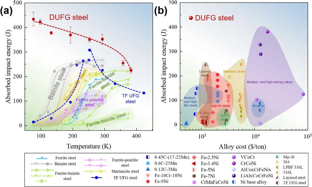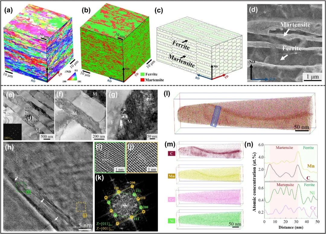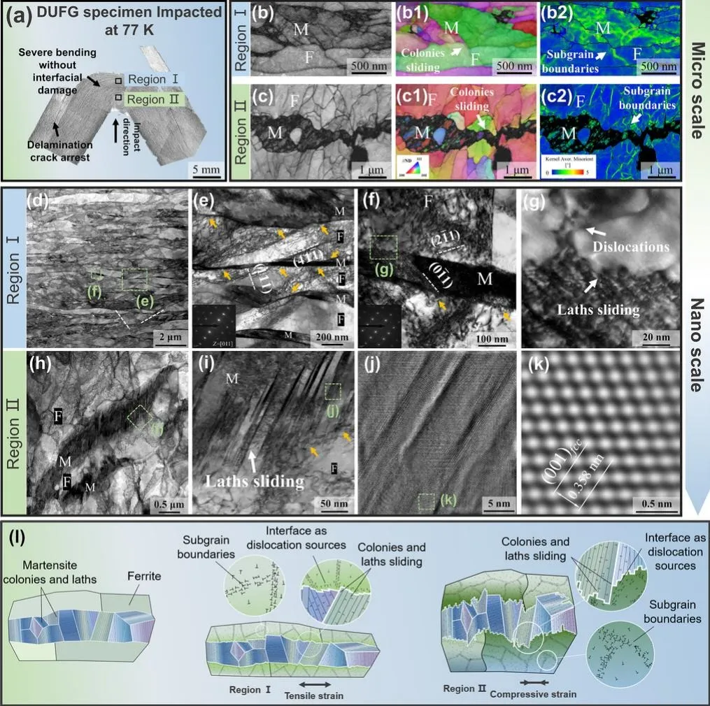 图1:展示了所设计的双相超细晶(DUFG)钢的微观结构特征。图(a)的EBSD相图和(b)的TKD相图均清晰显示了由超细晶铁素体(红色)和马氏体(蓝色)交替排列而成的层状结构。图(c)为对应的三维结构示意图,直观呈现了该层状组织的空间构型。图(d)的厚度分布统计显示,铁素体层和马氏体层的平均厚度分别为0.74微米和0.46微米。高分辨率TEM图像(e-g)证实了铁素体层内几乎无位错的洁净状态。图(h-k)和原子探针断层扫描(APT)结果(l-n)进一步揭示了马氏体板条间存在纳米级残余奥氏体薄膜,以及C、Mn、Cr、Ni等元素在铁素体/马氏体(F/M)界面处的偏聚,为理解其独特的界面行为和变形机制提供了关键信息。 图2:综合展示了DUFG钢优异的力学性能。图(a)为裂纹扩展方向与层状结构取向关系的示意图(裂纹止裂器CA和裂纹分束器CD方向)。图(b)的拉伸曲线显示,随着温度从293 K降至77 K,材料的屈服强度和均匀延伸率协同提升,表明其具有反常的温度依赖性。图(c)的夏比冲击能量-温度曲线揭示了一个更惊人的现象:在CA取向下,冲击韧性从383 K时的226 J逆势增加至77 K时的434 J,完全颠覆了传统BCC钢的韧性-脆性转变行为。图(d)的断裂韧性(R曲线)测试结果进一步证实,在77 K的极低温下,DUFG钢在CA和CD取向下均表现出显著的裂纹扩展阻力,启裂韧性KJIc分别高达193.4 MPa√m和167.4 MPa√m,并具有上升的R曲线行为。 图3:深入解析了DUFG钢在77 K低温冲击变形后的微观结构演化与增韧机制。图(a)展示了冲击后样品发生大变形但未断裂的宏观形貌,证明了其卓越的损伤容限。对承受拉应力(区域I)和压应力(区域II)的局部进行详细表征。EBSD反极图(b1, c1)和核平均取向差(KAM)图(b2, c2)显示,铁素体和马氏体均经历了显著的塑性变形,且应变在界面处相容。TEM分析(d-i)揭示了关键变形机制:在铁素体中,F/M界面作为位错源,发射出大量位错并形成位错墙;在马氏体中,观察到了从微米尺度马氏体集束到纳米尺度马氏体板条的多级滑移。图(j, k)证实了板条间残余奥氏体薄膜在促进板条滑移中扮演“润滑”角色。图(l)的示意图总结了本征增韧机制:界面位错活性和马氏体亚结构多级滑移协同作用,实现了低温下巨大的塑性耗散。 图4:通过对比分析,凸显了DUFG钢性能的突破性与经济性优势。图(a)将DUFG钢(CA取向)的冲击能量-温度曲线与文献中多种低合金BCC钢进行对比,清楚表明只有DUFG钢实现了冲击韧性随温度降低而升高的“反温度依赖”行为,完全避免了传统的韧性-脆性转变。图(b)的Ashby图在77 K下对比了各种低温钢(包括高合金奥氏体钢和高熵合金)的冲击能量与合金化成本(以“合金指数”表征,与Ni、Co、Cr等贵金属含量正相关)。DUFG钢的数据点(红色五角星)位于图的右上区域,意味着它同时实现了最高的冲击韧性和最低的合金化成本,在性能和资源可持续性方面均超越了现有材料体系。