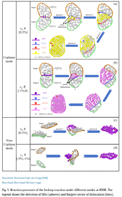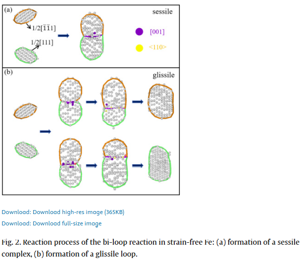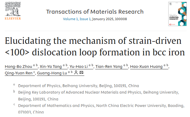 在高能粒子辐照环境下,材料内部会不断产生和演化位错环等缺陷结构,深刻影响材料的微观组织稳定性及服役性能。尤其是在体心立方(bcc)金属中,实验中频繁观测到的 <100> 位错环,因其理论稳定性低、迁移能力弱,其真实形成机制长期以来备受争议,成为辐照损伤物理中的关键科学问题之一。 围绕这一难题,北京航空航天大学吕广宏教授团队以 bcc 铁为模型体系,基于大规模分子动力学模拟,系统研究了外加各向异性应变条件下,1/2<111> 位错环相互作用与 <100> 位错环形成的原子机制。研究发现,应变不仅显著改变位错环反应路径,更可大幅降低反应能垒,从而为 <100> 位错环的“高频出现”提供了全新的物理解释。 该工作在机制层面打通了模拟—实验—预测模型之间的关键链条,为辐照损伤演化评估及抗辐照材料设计提供了重要理论支撑。 文章信息 https://doi.org/10.1016/j.tramat.2025.100008 文章亮点速览 亮点一|应变驱动 <100> 位错环形成 工作内容:通过分子动力学模拟,系统比较了无应变与单轴拉/压应变条件下,两条滑移的 1/2<111> 位错环相互作用行为,首次明确指出:在无应变条件下几乎不可能形成<100> 位错环,而外加各向异性应变可显著促进其生成。 研究价值:突破传统“位错反应需苛刻几何条件”的认知,为实验中<100> 位错环的普遍存在提供合理物理解释。 亮点二|两类原子尺度反应路径 工作内容:研究发现,在不同应变方向下,位错环反应可分别经历共面模式与非共面模式两类演化路径,涉及多中间态、多间隙原子的协同重排过程。 研究价值:系统构建 <100> 位错环形成的完整原子图景,丰富了辐照缺陷动力学的微观认知。 亮点三|应变降低反应能垒 工作内容:结合 NEB 方法与 Arrhenius 分析,定量给出了各关键反应步骤的激活能垒,并揭示其随单轴应变增加而显著降低,部分路径甚至转变为“近乎无能垒”过程。 研究价值:从动力学角度解释了应力/应变环境对辐照缺陷演化的放大效应。 亮点四|形成概率预测模型 工作内容:综合应变幅值与位错环尺寸差异,构建形成概率预测模型,并与分子动力学结果高度一致。 研究价值:为团簇动力学、动力学 Monte Carlo 等多尺度模拟提供可直接嵌入的物理模型。 文章核心图表 结语 总体而言,吕广宏教授团队围绕辐照损伤领域中极具争议的 <100> 位错环问题,从原子尺度出发,系统揭示了外加载应变在调控位错环反应路径与动力学行为中的关键作用。研究不仅澄清了 <100> 位错环“低稳定性却高出现频率”的长期矛盾,也为理解辐照条件下复杂缺陷结构的演化机制提供了坚实的理论依据。 更重要的是,该工作突破了传统位错反应模型对几何条件和尺寸匹配的严格限制,提出了一种更具普适性的形成机制,并通过定量预测模型实现了从微观机制到工程评估的跨越。 该成果对核结构材料、航天服役材料及其他极端环境用材料的辐照损伤评估具有重要指导意义,也为未来应力/应变调控缺陷演化、设计高抗辐照性能材料提供了新的研究思路与方法框架。