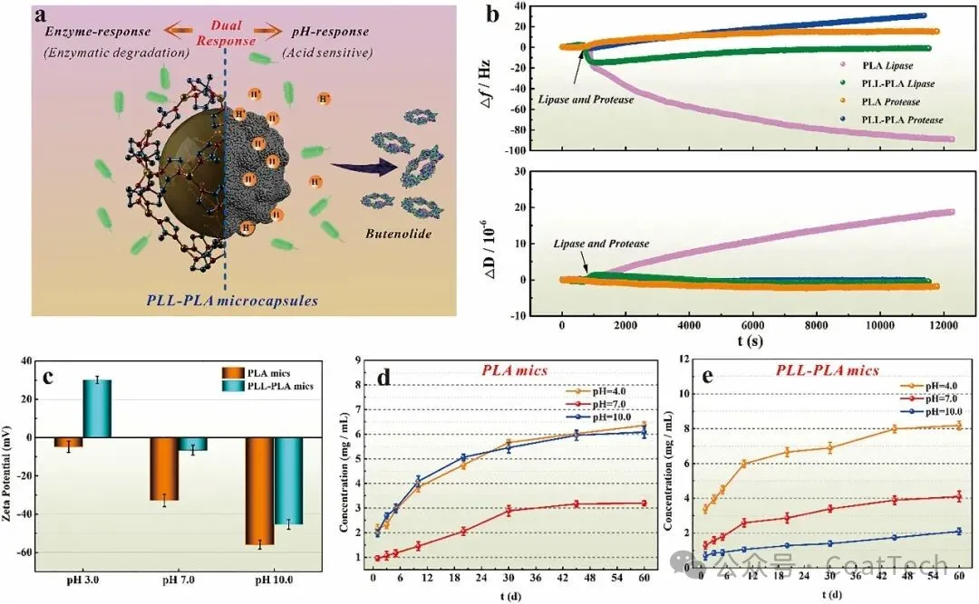 一方面,研究团队以可生物降解的聚乳酸为基底,通过聚赖氨酸改性制备出pH / 酶双响应微胶囊,内部包裹着从海洋链霉菌中提取的天然防污剂丁烯内酯。这种防污剂低毒、易降解,对海洋生物几乎无生态危害,还能有效抑制藤壶、硅藻等主要污损生物的附着。更关键的是,微胶囊能 “感知” 海洋生物污损的早期信号:当污损生物开始附着并分泌酶、形成酸性微环境时,微胶囊会被触发,精准释放丁烯内酯,实现 “按需防污”,既提升了防污剂的利用效率,又避免了无差别释放造成的浪费。 图2:微胶囊的 pH 值与酶响应测试