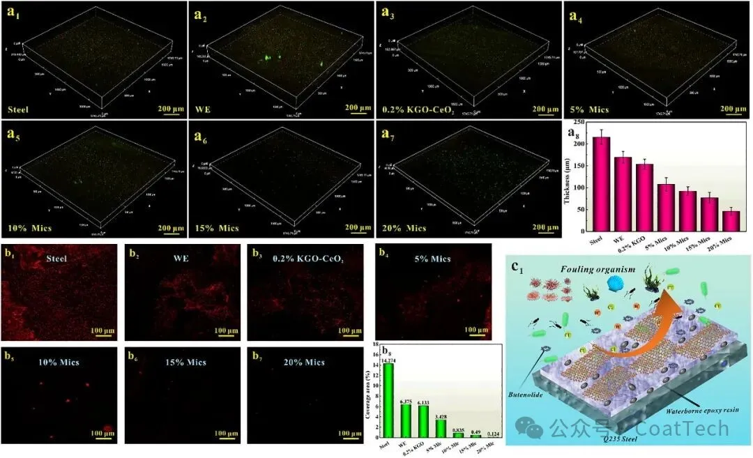 将这两种核心组分掺入无溶剂水性环氧树脂中,最终制备的复合涂层表现出优异的综合性能。实验表明,当添加 0.2% 的改性氧化石墨烯和 20% 的双响应微胶囊时,涂层性能达到最优:附着力较纯环氧树脂涂层大幅提升,30 天海水长期浸泡后,腐蚀电阻仍维持在高水平,腐蚀电流远低于传统涂层;对硫酸盐还原菌、硅藻等污损生物的抑制效果显著,硅藻表面覆盖率降至 0.124%,几乎实现无附着。