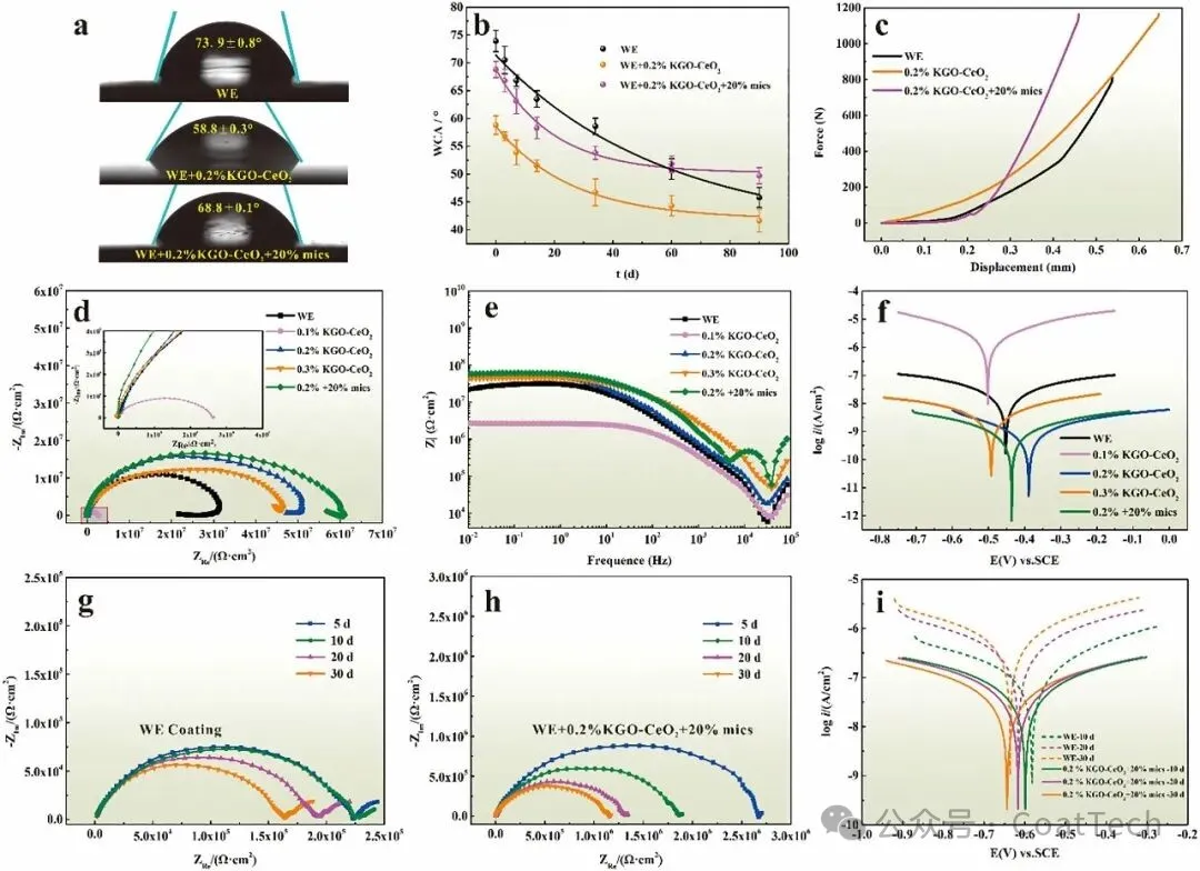 另一方面,为了解决氧化石墨烯在涂层中易团聚、分散性差的问题,研究团队用硅烷偶联剂对其进行共价改性,还在其表面原位生长了二氧化铈纳米颗粒,制备出改性氧化石墨烯复合材料。这一改性让氧化石墨烯的分散性大幅提升,其二维片层结构能形成致密的物理屏障,阻挡海水、氯离子等腐蚀性介质侵入;而二氧化铈的氧化还原对能在金属表面形成稳定的钝化层,还能水解生成物质封堵涂层微孔,通过 “物理屏障 + 化学钝化” 双重作用,实现长效防腐。
