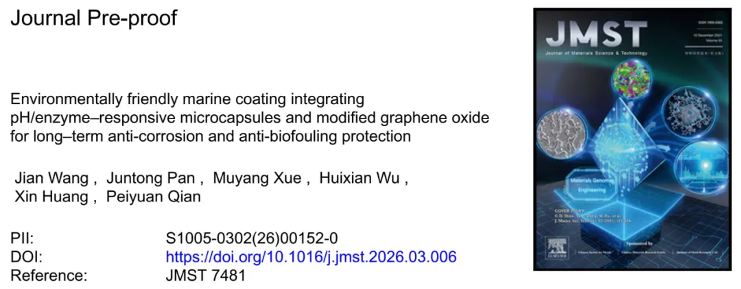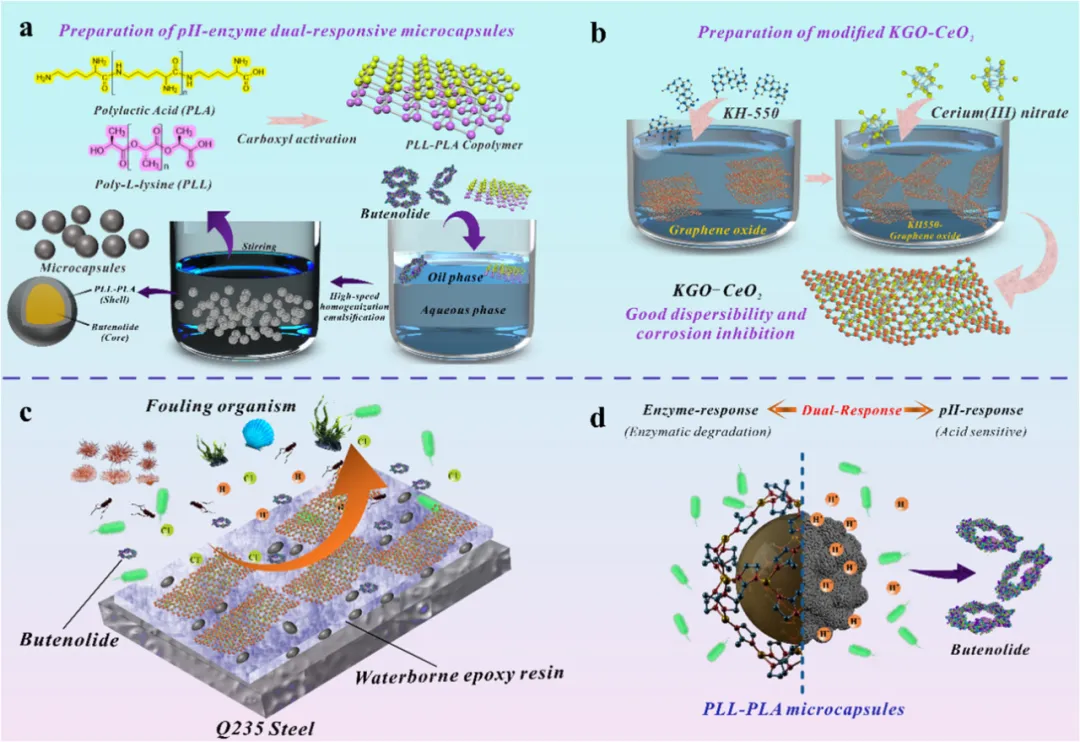 利用聚乳酸(PLA)作为微胶囊壳基质,使用聚-L-赖氨酸(PLL)进行改性,制得pH/酶双响应PLL-PLA微胶囊;使用γ-氨基丙基三乙氧基硅烷(KH550)对氧化石墨烯(GO)进行共价改性,同时将CeO2纳米颗粒原位生长在GO表面,制得KGO-CeO2纳米复合材料;然后将双响应微胶囊和 KGO-CeO2纳米复合材料协同分散在无溶剂水性环氧树脂中,获得智能防护涂层。 所制得的涂层实现了天然抗污剂(丁烯羟酸内酯)的可控释放,增强了在生物膜形成初期对微环境pH值降低和酶分泌的响应能力。当KGO-CeO2含量为0.2wt%时,该涂层具有优异的防腐性能,并且在长期腐蚀监测中性能保持稳定。此外,含有20wt% PLL-PLA微胶囊的涂层表现出良好的抗生物污损效果,有效地抑制了硅藻的附着和SRB生物膜的形成。 本研究为生产高性能海洋防护涂料提供了一种新颖的设计策略。 制备工艺和机理示意图 微胶囊及改性GO的制备工艺和机理示意图。(a)PLL修饰的PLA赋予微胶囊pH值和酶双重响应机制;采用O/W法制备微胶囊。(b)通过KH550改性制备的KGO提高了GO的分散性,CeO2的原位生长提高了其缓蚀能力。(c)改性WE涂层的防腐防污机理。(d)微胶囊的pH/酶双重反应机制。 数据来源与出处 相关研究成果以“Environmentally friendly marine coating integrating pH/enzyme‑responsive microcapsules and modified graphene oxide for long‑term anti-corrosion and anti-biofouling protection”为标题发表在《Journal of Materials Science & Technology》上。