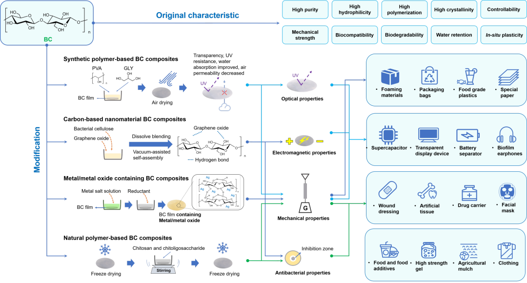 先进的改性策略进一步拓展了BC在基础生物塑料之外的应用。例如,其光学与电学性能可按需定制,应用于超级电容器、电池隔膜、声学材料及面向人工智能的可穿戴设备等高科技领域。在医疗方面,具有抗菌功能的BC在伤口敷料、面膜等产品中已实现商业化,成为替代传统塑料的重要组成部分。此外,在农业与纺织领域,性能增强的BC同样展现出替代传统材料的潜力,如地膜与功能性织物(图3)。上述应用充分体现了BC的多功能性与广泛应用前景,是推动多个行业创新与可持续发展的重要材料。