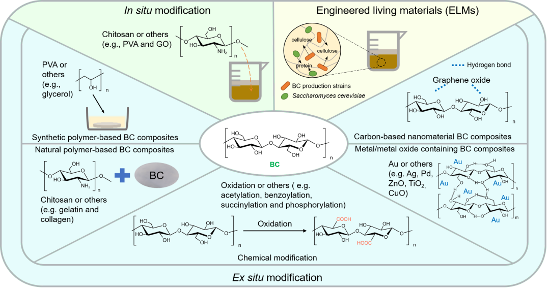 尽管BC本身已具备优异的性能,但为进一步发挥其潜力、满足不同应用场景的特定需求,研究者仍采用了多种增强技术。这些技术主要涵盖对孔隙率、结晶度、化学结构及功能性的调控,通常可分为非原位改性、原位改性,以及工程活体材料(ELMs)三类(图2)。其中,非原位改性主要包括化学改性和复合材料制备;复合材料根据添加材料类型,可进一步分为合成聚合物、天然聚合物、碳基纳米材料、以及金属或金属氧化物复合材料。原位改性则是在BC生产过程中引入外源材料。ELMs通过将产纤维素细菌与其他工程菌株共培养实现,也可归入原位改性范畴。