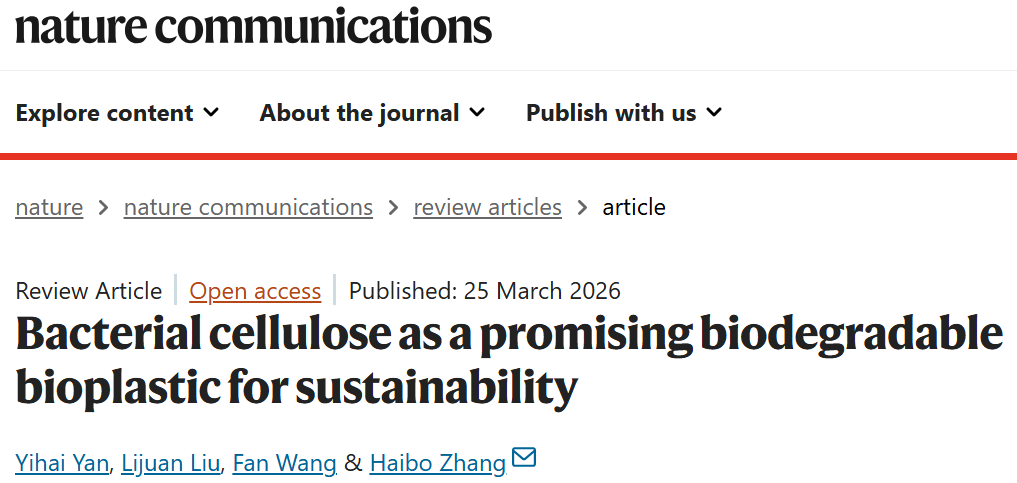 2026年3月25日,基于在该领域的研究,青岛能源所张海波研究员团队在Nature Communications上发表了题为“Bacterial cellulose as a promising biodegradable bioplastic for sustainability”的综述文章,系统阐述了BC作为可降解生物塑料的研发进展和未来发展前景。文章介绍了BC的合成、改性-结构-性能关系、环境影响、技术经济分析及其对促进循环经济的贡献,重点阐述了BC作为生物塑料的潜力,并探讨了其当前局限性及可行解决方案。张海波研究员为该文章的通讯作者,严逸海、刘丽娟、王帆为共同第一作者。研究得到国家自然科学基金、泰山学者项目的支持。