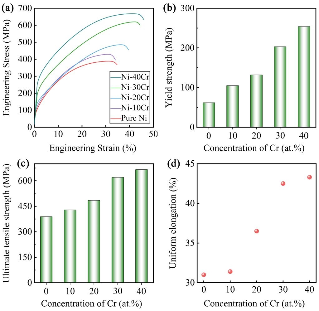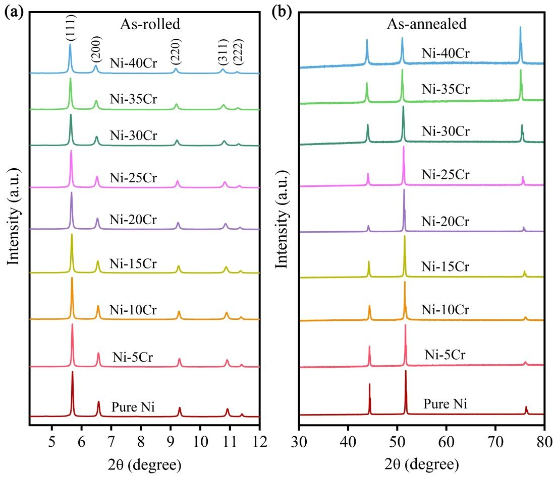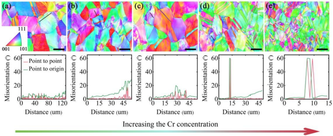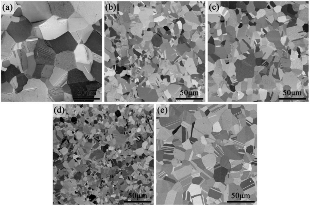 图2 Ni-Cr合金再结晶退火后的SEM图像。 (a)纯Ni(b)Ni-10 Cr(c)Ni-20 Cr; (d)Ni-30 Cr在1073 K下退火1小时后; (e)Ni-40 Cr在1173 K下退火1小时后。