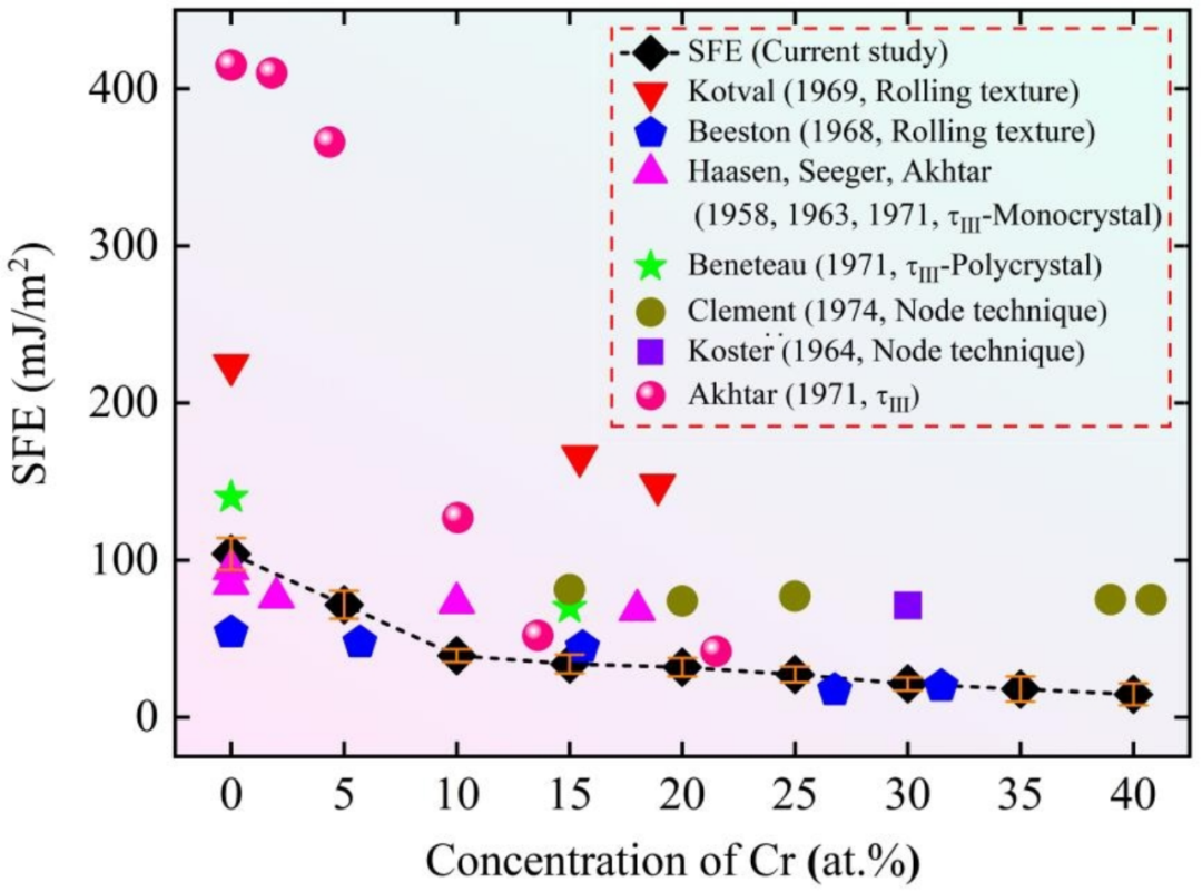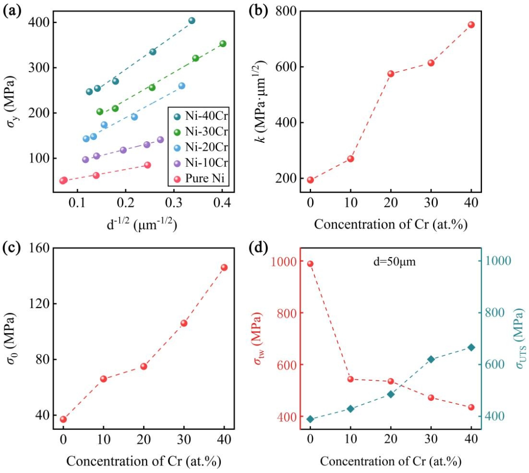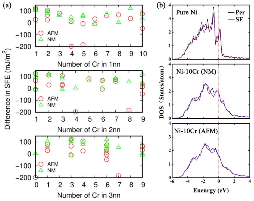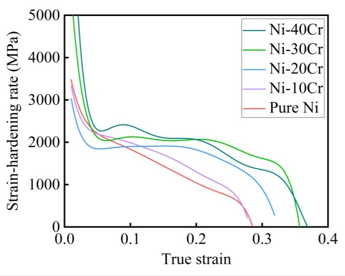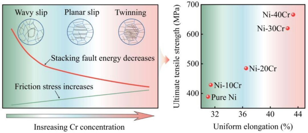 图4 来自各种公开文献的Ni-Cr合金的SFE报告;当前结果由黑色菱形曲线表示。 图5 (a)计算模型,其中示出了SF位置 (b)AFM和(c)NM磁结构的Ni-Cr合金的SFE; (d)在不同Cr成分下AFM和NM配置的平均SFE; (e)NM态的总电子密度和自旋密度的等值面图的切片Ni原子是银,Cr原子是紫色球。 图6 (a)超临界流体能量随Cr在靠近超临界流体的1 nn、2nn和3 nn平面中的局部浓度的变化;(b)靠近超临界流体的1 nn平面中的电子态密度;红色虚线表示费米能(Ef)。 图7 EBSD反极图(IPF)和退火Ni-Cr合金的Σ3比例 (a)纯Ni;(B)Ni-10 Cr;(c)Ni-20 Cr;(d)Ni-30 Cr;(e)Ni-40 Cr; (f)Σ3比例与Cr浓度之间的关系比例尺,100 μm。 图8 镍铬合金的机械性能。 (a)工程应力—应变曲线,(b)屈服强度, (c)极限抗拉强度,(d)均匀延伸率与铬浓度的关系。 图9 镍铬合金拉伸至颈缩开始时的EBSD IPF和局部取向差分析。 图10 (a)屈服应力和晶粒尺寸的Hall-Petch图。 Cr浓度增加与(b)Hall-Petch系数、(c)摩擦应力和(d)临界孪生应力之间的关系。 图11 镍铬合金的应变硬化曲线 图12 (a)Ni和Cr原子位置的三维APT重建; (b)沿着(a)黑线的一维浓度分布; (c)Ni和Cr元素的频率分布分析。 图13 Cr浓度增加与SFE和摩擦应力之间的关系及其对变形机制和力学性能的影响示意图。 结论: 结合X射线线轮廓分析和密度泛函理论计算,重新研究了Ni-Cr合金的层错能,给出了不同成分Ni-Cr合金层错能的定量值。随后,我们确定了超临界流体在控制变形机制中的真实的作用,阐明了Cr对应变硬化能力和强度—塑性协同效应的有益影响的来源。 实验测得纯镍的超临界流体能量约为103 mJ/m2,与DFT计算结果接近(~ 130 mJ/m2),完全在预期范围内(79-180 mJ/m2)。随着Cr浓度的增加,SFE表现出初始急剧降低,而Ni-10 Cr的约为39.2 mJ/m2当Cr含量进一步增加到40 at.%时,SFE降低到14.6 mJ/m2。这是由于在费米能附近的电子态密度在Cr元素的存在下,在堆垛层错处的键临界点处的电荷增益降低了Ni的SFE。 Cr合金化不仅降低了SFE,而且增加了摩擦应力,但没有引起明显的短程有序化,SFE的降低与摩擦应力的增加共同促进了滑移平面性,并且有效地降低了临界孪晶应力,导致Ni中的形变孪晶,这些发现清楚地表明了超临界流体在控制Ni-Cr合金拉伸变形机制中的主导作用。 平面滑移带和变形孪晶的形成增强了应变硬化能力,而摩擦应力和Hall-Petch系数的同时增加提高了屈服强度,共同促进了Ni-Cr合金中Cr浓度增加(即减少SFE)的强度—延展性协同作用。