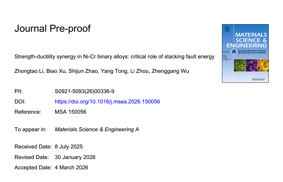 摘要:采用X射线谱线分析和密度泛函理论(DFT)相结合的方法,对Ni-Cr二元合金的层错能(SFE)进行了重新研究.实验测得纯Ni的SFE为~103 mJ/m²,与DFT计算的~130 mJ/m²非常接近.当Cr含量增加到10at.%时,SFE表现出最初的急剧下降,达到约39.2 mJ/m²进一步增加Cr含量到40 at.%时,SFE降低到14.6mJ/m². DFT研究表明,Cr合金化降低SFE的原因是Cr通过电荷转移效应对Ni-Cr合金的电子态做出了积极的贡献.除降低SFE外,Cr合金化提高了Ni-Cr合金的摩擦应力,但没有引起明显的短程有序(SRO).拉伸试验表明,Cr含量的增加提高了Ni-Cr合金的应变硬化能力,显微组织分析证实,当Cr含量达到30 at.%时,在拉伸变形过程中开始产生形变孪晶在此基础上,提出了降低SFE而不是提高SRO是控制变形模式转变、提高应变硬化性的关键因素。 背景: 多主元素合金的出现为评估各种以前未探索的合金效应提供了大量机会。一个代表性的例子是Cr对Ni集中的面心立方(FCC)合金的机械行为的关键影响。这些影响通过对CoCrFeMnNi系列等原子二元合金的全面实验和理论研究揭示,三元、四元和五元合金。相关研究表明,将Cr合金化到各种合金中显著改善了它们的固溶体强化和应变硬化。固溶强化被理解为大的弹性失配的结果,这在传统的Ni基或Ni富集合金中经常观察到。(在40 at.% Cr时高达1.89%体积错配)预计将使固有摩擦应力(σ0)增加到与代表性多主元素合金中观察到的水平相当的水平,例如CoCrFeMnNi、CoCrFeNi和CoCrNi合金。相比之下,Cr对应变硬化的有益作用较少被认识,并且潜在的物理机制仍未被发现。 在FCC合金中,变形孪晶作为控制应变硬化行为的关键机制,主要由层错能(SFE)控制。降低SFE已被证明诱导从波浪滑移到平面滑移和变形孪晶的转变,增强应变硬化能力并延迟颈缩不稳定性。除了SFE的主要影响外,新出现的Journal Pre-proo 3研究表明,包括短程有序(SRO)和σ0在内的其他内在因素可以通过不同的途径影响变形机制。具体而言,提高SRO程度会导致滑移面软化,而增加σ0会抑制Shockley部分位错的重组,所有这些都可以促进滑移平面性。位错很少从平面滑移带中交叉滑移,导致位错在滑移带内快速积累,然后增加应变硬化率。在这种情况下,通过合金化调整这些内在因素已被证明是克服强度—延展性折衷的最有效策略之一。 认识到二元合金在隔离这些因素在变形机制中的作用方面的优势,一些研究开始将焦点转向Ni-Cr合金,以分离Cr的明显影响。这些研究的共识表明,高达40 at.%的Cr添加量引起的SFE和Ni的σ0的变化可以忽略不计。基于此,Cr含量的增加导致了钢的强度-塑性协同效应和疲劳性能的优化,这主要归因于SRO程度的提高,但目前的观点并不令人信服。如后所述,有几十年前关于Ni-Cr合金的SFE数据的公开文献报道,其结果产生了很大的差异。这些差异需要重新审视Ni-Cr合金以定量确定其SFE值。因此,Ni-Cr合金的变形机制是否仅受SRO影响仍然是一个悬而未决的问题。 在这项工作中,我们通过结合X射线Journal Pre-proo 4谱线轮廓分析和密度泛函理论(DFT)计算来重新审视Ni-Cr合金的SFE,以确定它们在变形机制转变中的真实的作用。这种方法的目的是阐明Cr对应变硬化性有益影响的起源。其他内在因素,即σ0(max)和SRO,通过Hall-Petch关系和原子探针层析成像(APT)实验确定了Cr含量对应变硬化行为的影响,为设计具有良好强度和塑性的新型高铬镍基合金提供了依据。 该项研究成果以“Strength-ductility synergy in Ni-Cr binary alloys: critical role of stacking fault energy”为题,在线发表于国际期刊《Materials Science & Engineering A》。香港城市大学机械工程系赵仕俊、湖南大学材料科学与工程学院吴正刚为该论文通讯作者。该研究工作获得了国家自然科学基金项目(No.52404391和No.52271145)的资助。 文章链接: https://www.sciencedirect.com/science/article/abs/pii/S0925838826009990?via%3Dihub 图1 镍铬合金的X射线衍射图谱。 (a)同步辐射X射线衍射;(B)X射线衍射。