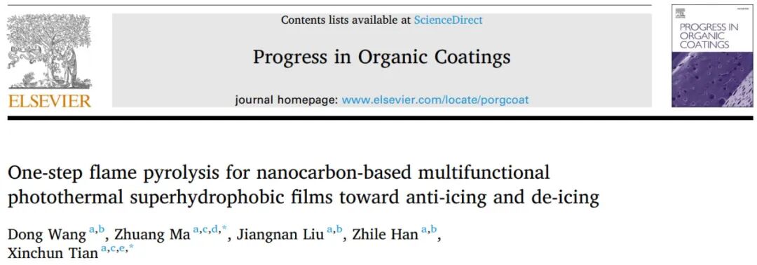 近期,北京理工大学马壮/田新春团队开发了一种快速的一步火焰热解策略,用于制备具有多功能、可扩展且柔韧性的纳米碳基光热超疏水薄膜。