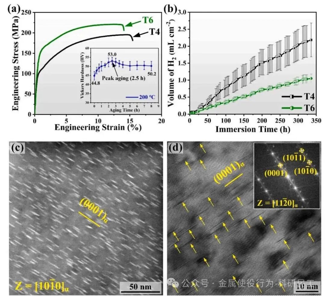 图 1. (a) T4 和 T6 样品的拉伸曲线。(a) 中的插图为 Mg-0.5Zn-0.25Ca-0.7Nd 样品在 200 °C 时效处理后的维氏硬度变化。(b) 研究合金在 3.5 wt.% NaCl 溶液中浸泡 336 小时内的析氢测量结果。(c) T6 合金中沿 [100] 区轴拍摄的HAADF-STEM 低倍像,显示析出相分布。(d) T6 样品中 Mg 基体沿 [110] 区轴的BF-TEM 图像及对应的 FFT 衍射花样。