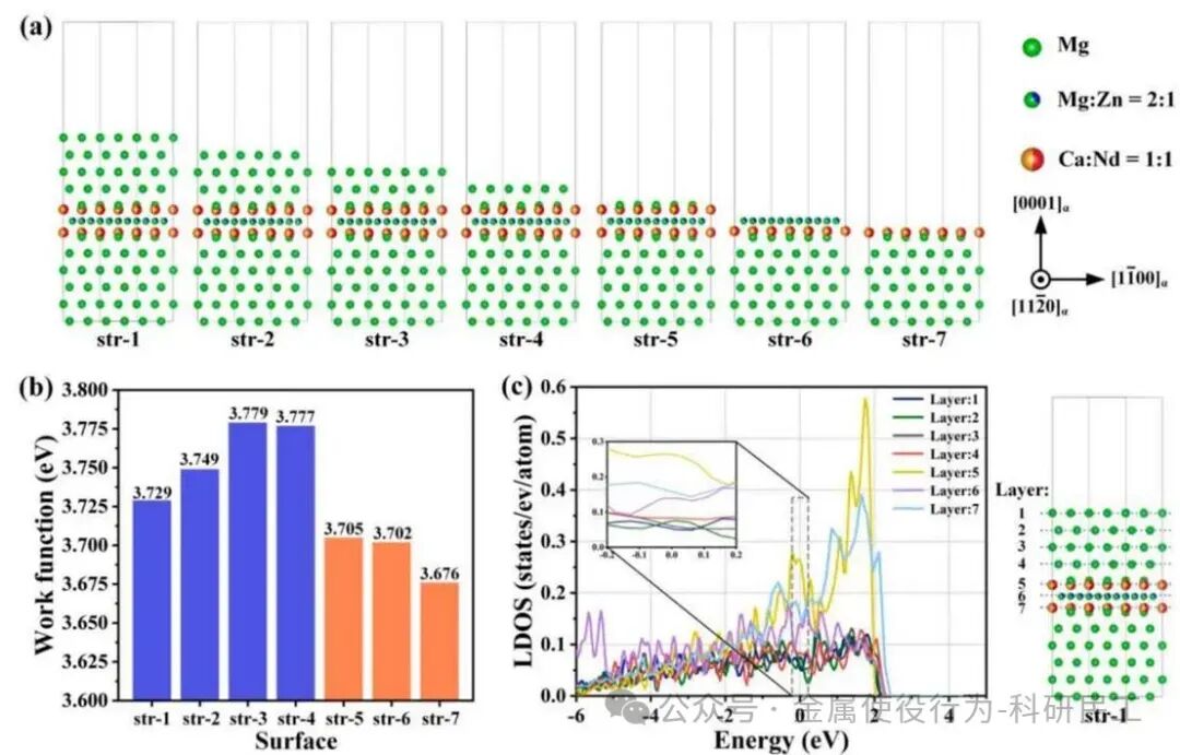 图 4. 本合金中嵌入 Mg 基体的 γ″ 相的原子结构及耐蚀性分析。(a) 根据 Li 等人 [43] 的结构模板构建的 Mg 和三层层状 γ″ 的不同表面的原子结构。(b) 各表面的功函数。(c) 基体及 γ″ 析出相内部不同原子层电子的局域态密度。