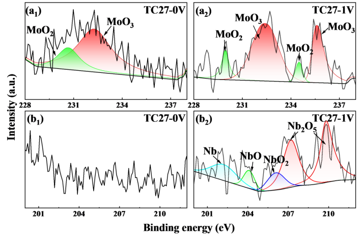 图9 极化前后Nb和Mo在TC27中的存在形式。依据E-pH图证实极化后大量存在的不稳定MoO3会向MoO2转变。依据PDM模型,低价氧化物的会导致钝化膜中缺陷浓度的提升。由于TC4中不存在Nb和Mo元素,因此其钝化膜保护能力在极化后超过TC27。