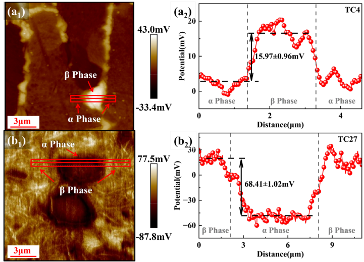 图2 (a1) TC4和(b1)TC27的SKPFM图样; (a2)TC4和(b2)TC27 α相和β相之间的电势差。高的电势差表明更强的微电偶效应,从而能在α相表面形成更加致密的钝化膜,提升TC27在自然浸泡状态下的耐蚀性。