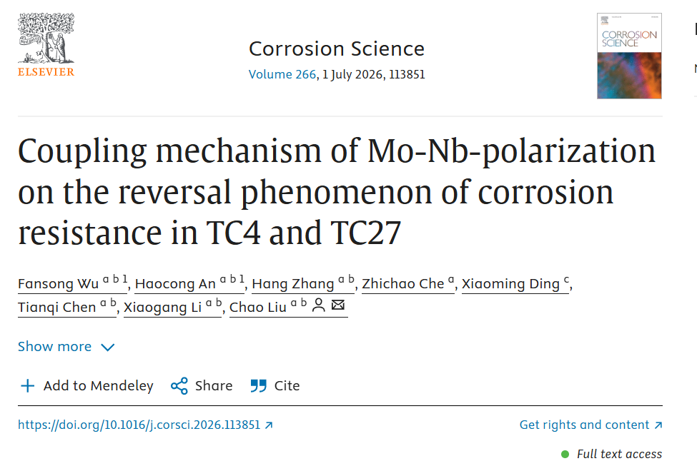 导语:北京科技大学国家材料腐蚀与防护科学数据中心李晓刚教授、刘超教授团队联合中国航发北京航空材料研究院,系统阐明了在模拟污染海水环境中,Mo-Nb合金化与恒电位极化耦合作用对TC4和TC27钛合金耐蚀性反转现象的调控机制。研究发现,钛合金的耐蚀性伴随不同的极化条件而表现出明显的反转特性。在自然浸泡条件下,含Mo、Nb的TC27耐蚀性更优。经恒电位极化处理后,两种合金的耐蚀性则完全反转,TC4展现出更优异的钝化膜防护性能与抗点蚀能力。这主要是因为在自然浸泡状态下,合金耐蚀性由基体相组成主导,TC27更高的β相占比及Mo、Nb元素在β相的富集,导致其耐蚀性由于TC4。而极化后,TC4形成富含保护性Ti (OH)x的稳定钝化膜,Ti、Al充分氧化为稳定氧化物,钝化膜中的缺陷较少。而TC27钝化膜中的Mo、Nb 元素则以非稳定的价态存在,导致高价氧化物自发还原为低价态。基于点缺陷模型(PDM),这些转变会导致钝化膜中氧空位的生成,从而提升膜内缺陷密度,最终引发耐蚀性的反转。(论文第一作者为伍凡松硕士和安浩聪硕士)