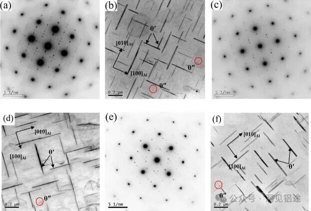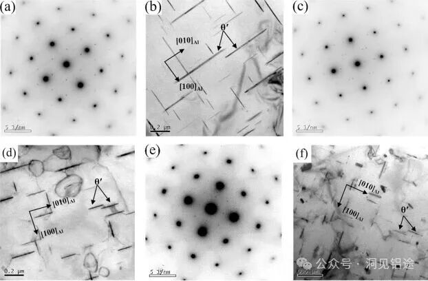 图4. 160 °C-T6态RR350合金在300 °C下不同耐热时间的TEM图像:(a) 和 (b) 0.5小时;(c) 和 (d) 10小时;(e) 和 (f) 200小时。