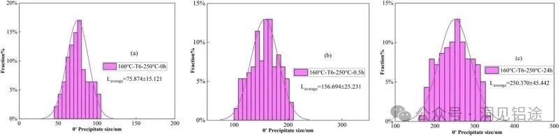 图10. 160 °C-T6态RR350合金在250 °C下不同耐热时间的θ'相尺寸分布图:(a) 0小时;(b) 0.5小时;(c) 24小时。