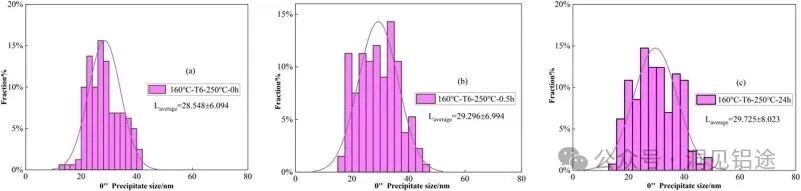 图9. 160 °C-T6态RR350合金在250 °C下不同耐热时间的θ″相尺寸分布图:(a) 0小时;(b) 0.5小时;(c) 24小时。