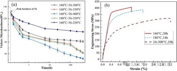 图1. 样品加热后的力学性能:(a) 硬度;(b) 拉伸曲线。