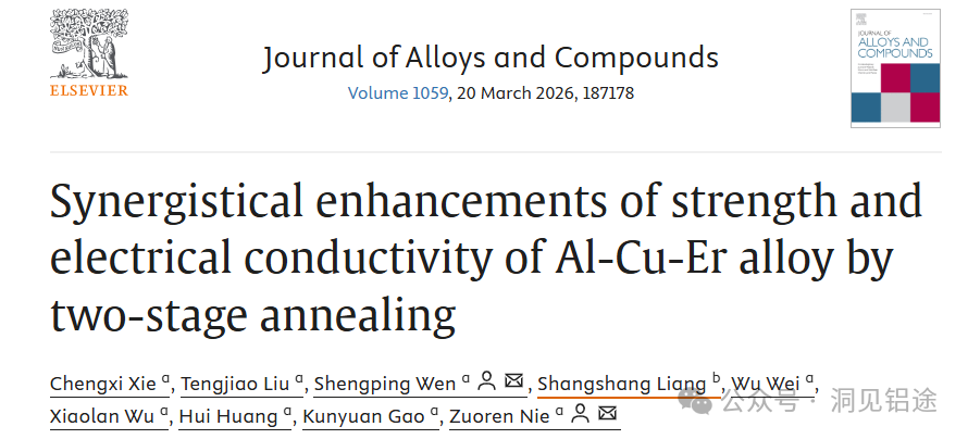 ——导读—— 北京工业大学聂祚仁院士联合太原科技大学团队,在《Journal of Alloys and Compounds》期刊发表了题为“Synergistical enhancements of strength and electrical conductivity of Al-Cu-Er alloy by two-stage annealing”的文章。该研究针对Al-Cu合金强度与电导率难以兼得的问题,提出了Er微合金化结合两段退火(300°C/3h+200°C/24h)的方法,获得了硬度62.4 HV、电导率60.5% IACS、154°C下服役寿命约40年的高性能合金,机理在于高温优先析出热稳定Al₃Er纳米颗粒,低温析出θ'-Al₂Cu强化相,实现协同强化。DOI: 10.1016/j.jallcom.2026.187178 论文题目:Synergistical enhancements of strength and electrical conductivity of Al-Cu-Er alloy by two-stage annealing |