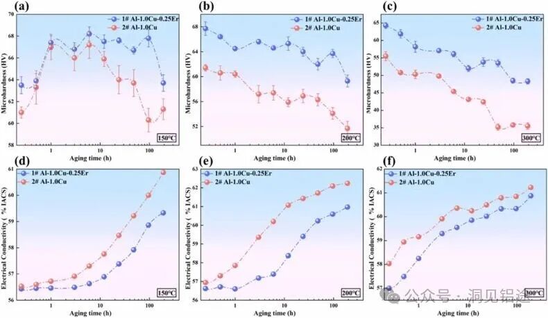 ——研究背景—— Al-Cu合金因其轻质、低成本、优异的导电性和机械加工性,已成为电力传输(例如架空导线、母线)和新能源设备(例如充电桩导体、储能装置连接线束)的核心导体材料 [1,2]。然而,强度与导电性之间的固有矛盾,以及长期服役条件下热稳定性不足,已成为制约Al-Cu合金进一步发展和应用的核心挑战 [3,4]。 通常,Al-Cu合金优异的力学性能主要源于强化相(θ'-Al₂Cu)的析出和微观组织细化。Al₂Cu析出相通过钉扎位错和界面强化提高强度,但这些析出相及基体中残留的溶质原子会增加电子散射,从而降低电导率 [5]。同时,纯Al-Cu合金耐热性较差——在高温下容易发生再结晶和析出相粗化,导致快速软化和性能下降 [6,7,8]。显著缓解这种"强度-电导率-耐热性"之间的权衡关系,长期以来一直是铝合金材料领域的研究焦点。 应对这一挑战的相关研究工作主要可分为两个方向:微合金化改性和热处理/热机械工艺优化。在微合金化方面,稀土元素和过渡金属(如Zr、Ti)因其独特的原子结构及与Al基体的相互作用而备受关注。其中,Zr能形成具有一定热稳定性的Al₃Zr析出相,但其析出动力学缓慢,且与α-Al的晶格失配度相对较高,导致中等程度的电子散射;Ti倾向于形成粗大的TiAl₃相,不利于合金的塑性和导电性 [9]。Sc通过Al₃Sc析出相显示出显著效果,但其高昂的成本(约为Er的80–100倍)限制了其大规模工业应用 [10,11]。相比之下,Er作为高效微合金化元素更具潜力。Er在Al基体中倾向于形成具有L1₂结构的热稳定性Al₃Er纳米颗粒 [12,13]。该相不仅能钉扎位错和晶界,抑制再结晶和析出相粗化 [14,15],而且Al₃Er相与面心立方结构的α-Al之间的晶格失配度低。因此,它不易诱发晶粒粗化,且对电子散射影响极小 [16,17]。这为实现合金强度和导电性的更好平衡提供了重要的结构基础。 在工艺优化方面,传统的单段时效工艺因其析出温度区间不同,往往无法协调不同强化相的析出。例如,Al₂Cu(θ')相的析出温度通常为150–250°C,而Al₃Er相的析出温度约为300°C [18,19]。单段退火要么优先形成Al₂Cu相但抑制Er析出,要么促进Al₃Er形成但以Al₂Cu回溶和再结晶为代价,难以同时优化强度、导电性和耐热性。诸如高压扭转等剧烈塑性变形工艺可以细化晶粒、增加位错密度以提高强度,但这往往导致电导率显著下降,只能通过后续退火部分恢复 [20]。其次,对该合金热稳定性和长期服役可靠性的定量表征尚不充分,这限制了其在新能源设备散热部件、高温电缆等高温条件下的应用 [2,21]。 为应对这些挑战,本研究聚焦于Er微合金化与新型两段退火工艺对Al-Cu合金的协同效应。通过引入Er作为微合金化元素,并设计"高温+低温"两段退火工艺,旨在开发出强度、电导率和耐热性部分解耦的高性能合金,为铝基导体材料的性能优化提供新策略。 |