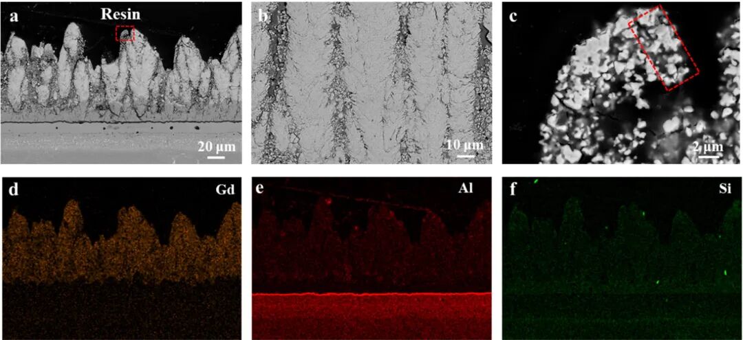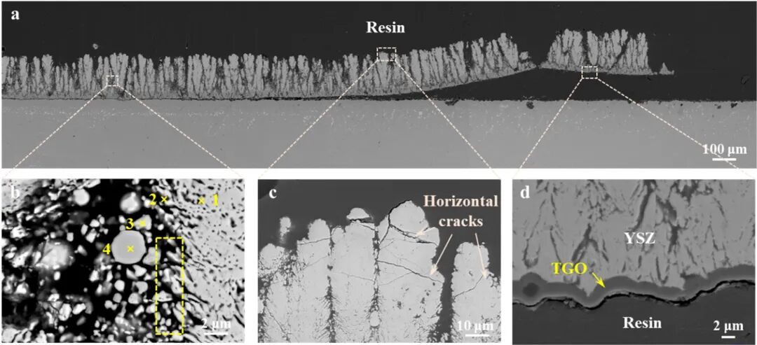 第一作者:郭奕谦 通讯作者:郭洪波、赵士腾 通讯单位:北京航空航天大学材料学院 DOI: 10.1016/j.jmst.2025.06.042 01 全文速览 北京航空航天大学郭洪波教授团队通过等离子物理气相沉积(PS-PVD)和超快激光直写技术联合构筑了新型微纳三级仿生结构热障涂层(TBCs)。研究表明该仿生结构可以通过物理结构和化学反应的双重机制抑制熔体润湿和下渗,具有该结构的涂层在模拟航空发动机服役工况的CMAS(CaO-MgO-Al₂O₃-SiO₂)耦合高温燃气热冲击实验中,展现出卓越的抗腐蚀性能,其热循环寿命超过4000次,相较于传统结构涂层提升了一倍以上。这种新型涂层为下一代高性能超高温热障涂层的设计提供了新思路。 02 研究背景 随着航空发动机向着更高推重比和燃烧室温度发展,热障涂层成为保护涡轮叶片等热端部件的关键技术。近年来,来自沙尘、火山灰等的环境沉积物(主要成分为CMAS)腐蚀问题成为了制约发动机安全性和寿命的致命威胁。CMAS粒子吸入发动机内部,在高温下熔融并黏附在叶片热障涂层表面,导致发动机服役寿命从几千小时降低至数十小时。近年来,新型氧化镱改性锆酸钆(GYbZ)材料因其更低的热导率和优异的抗CMAS性能而备受关注,但如何进一步提升其在动态、高温环境下的耐久性,仍是领域内亟待解决的难题。 03 本文亮点 (1)结构创新:首次将超快激光直写技术与PS-PVD技术相结合,在PS-PVD固有的微纳结构基础上,成功构建了新型的微纳三级结构,实现了对涂层表面形貌的精确重构。 (2)性能突破:在严苛的火焰热循环与CMAS动态沉积耦合测试中,该新型结构涂层的热循环寿命超过4000次,相比传统结构涂层(约2500次)提升一倍。这是目前文献报道中,在类似极端测试条件下表现最出色的结果之一。 (3)机理深化:结合实验表征与第一性原理计算,首次系统阐明了微纳三级结构提升抗CMAS腐蚀性能的双重机制:一方面,激光加工形成的新型结构物理抑制CMAS熔体在表面的润湿与铺展;另一方面,晶粒细化和晶界密度增加,加速了致密反应层的形成,有效抑制了CMAS的进一步渗透。 04 图文解析 图 1: (a) 制备态PS-PVD GYbZ涂层的表面形貌,呈现菜花状微凸起;(b) (a)中微凸起表面纳米颗粒的高倍放大图;(c) (b)中纳米颗粒的明场TEM图像。虚线椭圆区域内沿[001]晶带轴取向的电子衍射花样确认了萤石相的存在(左下角);(d) 制备态PS-PVD DCL TBC的截面形貌。 图2: (a) 激光加工PS-PVD GYbZ涂层的表面形貌,呈现规则分布的锥形微柱;(b) (a)中微柱的高倍放大图,显示激光烧蚀区域均匀分布的纳米颗粒;(c) (b)中纳米颗粒的明场TEM图像。虚线椭圆区域内沿[111]晶带轴取向的电子衍射花样确认了萤石相的存在(左上角);(d) 激光烧蚀后PS-PVD DCL TBC的截面形貌。 图3: 热循环测试后双尺度结构(a,d)和三级结构(b,e)TBC的宏观形貌,以及相应表面形貌的SEM图像(c,f)。 图4: 不同TBC的失效热循环次数(a)以及双尺度(b,c)和三级结构(d-f)TBC在CMAS侵蚀下热循环后的表面微观结构。 图5: (a) 制备态GYbZ/YSZ/NiPtAl涂层体系在CMAS耦合热冲击2500次后的截面微观形貌;(b-d) (a)中虚线矩形框所标示的顶部、中部和底部区域的高倍放大形貌。 图6: (a) 激光加工微纳三级结构GYbZ/YSZ/NiPtAl涂层体系在CMAS耦合热冲击4000次后的截面微观形貌;(b) 4000次循环后GYbZ涂层中部区域形貌,未见变化;(c) (a)中红色虚线矩形框区域的高倍SEM图像;(d-f) (a)中对应的Gd、Al和Si元素面分布图。 图 7: (a) 制备态双尺度结构涂层和(b)激光烧蚀后三级结构涂层的三维表面形貌及对应的二维轮廓图。制备态(c)双尺度结构和(d)三级结构涂层表面纳米颗粒的高角环形暗场(HAADF)图像及对应的Gd和Zr元素面分布图。(e) 不同表面形貌涂层的特征几何参数H/W。(f)双尺度结构和(g)三级结构涂层纳米颗粒尺寸的分布差异及平均值。 图8: (a) 热障涂层材料GYbZ、CMAS以及腐蚀产物Ca₂Gd₈(SiO₄)₆O₂和ZrO₂的模拟模型;(b) CMAS/GYbZ、CMAS/Ca₂Gd₈(SiO₄)₆O₂、CMAS/ZrO₂、Ca₂Gd₈(SiO₄)₆O₂/GYbZ和GYbZ/ZrO₂的模拟界面;(c) (a)中模拟模型的计算形成焓和内聚能;(d) (b)中模拟界面的计算分离功。 图 9: CMAS耦合热冲击4000次后反应区域的TEM分析。 图 10: 微纳三级结构涂层抗CMAS耦合作用下高温燃气热冲击性能的示意图。 图11:不同技术制备的热障涂层热循环寿命的Ashby图。 05 总结与展望 本研究通过将PS-PVD技术与超快激光直写技术巧妙结合,成功开发出了一种具有优异抗CMAS腐蚀性能的微纳三级结构热障涂层,为解决航空发动机热端部件CMAS腐蚀难题提供了有效方案。本研究创新性的提出的物理微纳结构设计与材料化学本征反应巧妙结合的抗腐蚀策略对于开发其他高性能防护涂层也具有重要的指导意义。 06 作者介绍 郭奕谦,北京航空航天大学材料学院讲师,主要研究方向为高温/超高温防护涂层。入选2024年全国博士后创新人才支持计划(博新计划A档),主持国家自然科学基金青年基金项目1项(2023),获2024年度中国复合材料学会卓越论文工程。以第一/通讯作者在Advanced Science,Journal of Materials Science & Technology等学术期刊发表SCI论文十余篇,ESI高被引论文1篇,申请/授权国家发明专利6项。 07 引用本文
