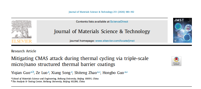Yiqian Guo, Ze Luo, Xiang Song, Shiteng Zhao, Hongbo Guo, Mitigating CMAS attack during thermal cycling via triple-scale micro/nano structured thermal barrier coatings, J. Mater. Sci. Technol. 251 (2026) 180-192