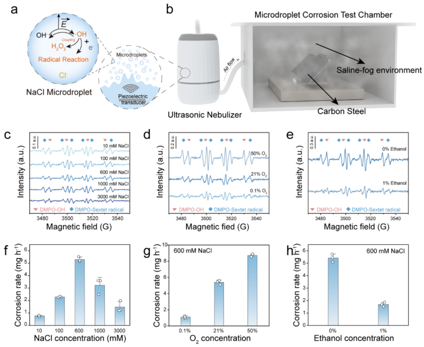 图2. NaCl微液滴中羟基自由基(·OH)活性及不同环境条件下的相应腐蚀动力学。(a) 微液滴中界面OH⁻电离产生·OH和电子从而加速自由基反应的示意图。(b) 实验装置示意图,包括超声雾化器和微液滴腐蚀测试舱。(c) NaCl浓度对微液滴中DMPO-OH EPR谱图的影响。(d) 氧浓度对微液滴中DMPO-OH EPR谱图的影响。(e) 乙醇对微液滴中DMPO-OH EPR谱图的影响。(谱图中,三角形标记对应于DMPO-OH加合物,代表·OH物种,而菱形标记表示六重峰信号,其归属尚存争议,此处称为“DMPO-六重峰自由基”。)(f) NaCl浓度对微液滴腐蚀速率的影响。(g) 氧浓度对微液滴腐蚀速率的影响。(h) 乙醇对微液滴腐蚀速率的影响。