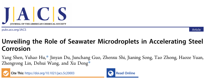 电子科技大学邓旭教授、胡宇皓博士合作首次揭示了海水微液滴通过自发产生活性自由基,显著加速碳钢腐蚀的微观机制。