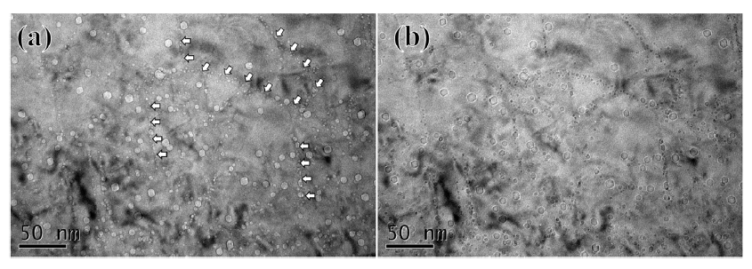 9展示了RC316L-1Hf样品中He气泡沿位错线的分布形态(深度200-450 nm)。图9(a)为欠焦TEM图像,图9(b)为过焦TEM图像,白色箭头指示位错线上密集分布的纳米级He气泡,表明位错作为He气泡异质形核位点和有效陷阱。