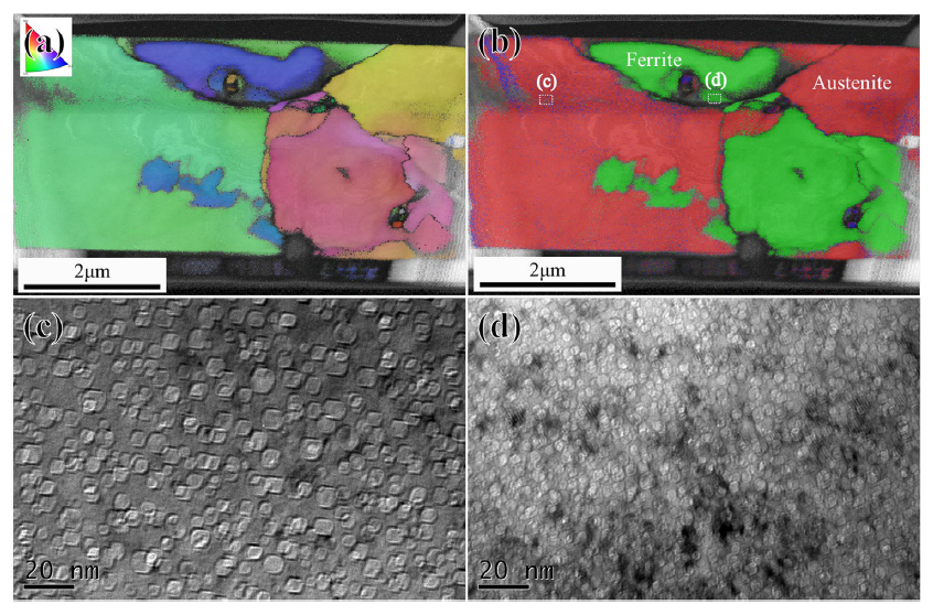 11展示了AB316L-1Hf样品中δ-铁素体和奥氏体的TKD表征及He气泡分布对比。图11(a)IPF图,图11(b)为相图,图11(c)显示奥氏体中存在较大He气泡(6.3±1.4 nm),图11(d)显示δ-铁素体中气泡尺寸小一半但数密度高2-3倍,表明BCC结构的δ-铁素体具有更优的抗肿胀能力。