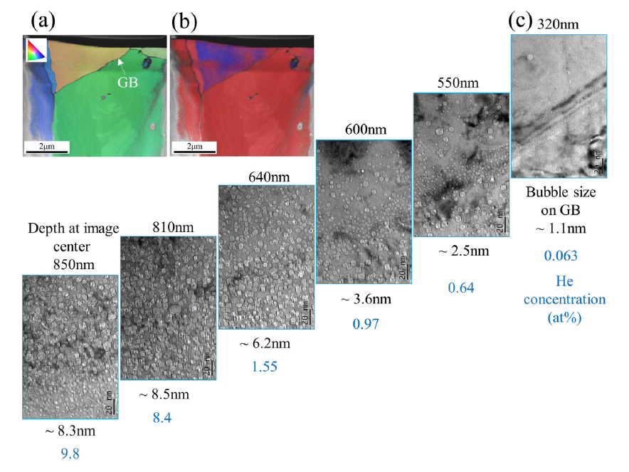10展示了RC316L-1Hf样品中随机大角度晶界(47.2°)处He气泡随深度的分布。图10(a)TKD-IPF图,图10(b)TKD相图,图10(c)显示不同深度下晶界上He气泡的形貌,表明随着He浓度从0.063 at.%升至1.55 at.%,晶界气泡尺寸从1.1 nm粗化至6.2 nm,晶界发生陷阱饱和。
