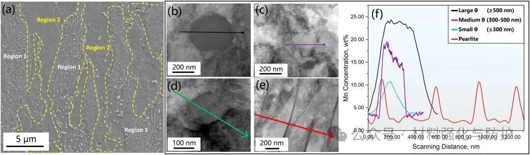 冷轧组织由变形的铁素体和珠光体区组成。STEM-EDS分析显示,渗碳体颗粒中的锰含量与尺寸有明显的相关性,大尺寸颗粒约含Mn约24wt.%,中尺寸颗粒约16wt.%,小尺寸颗粒小颗粒或珠光体片层约10wt.%,铁素体基质中的平均锰含量约为1.3wt.%,这种Mn的不均匀分布为后续快速退火后形成化学异质马氏体奠定了基础。