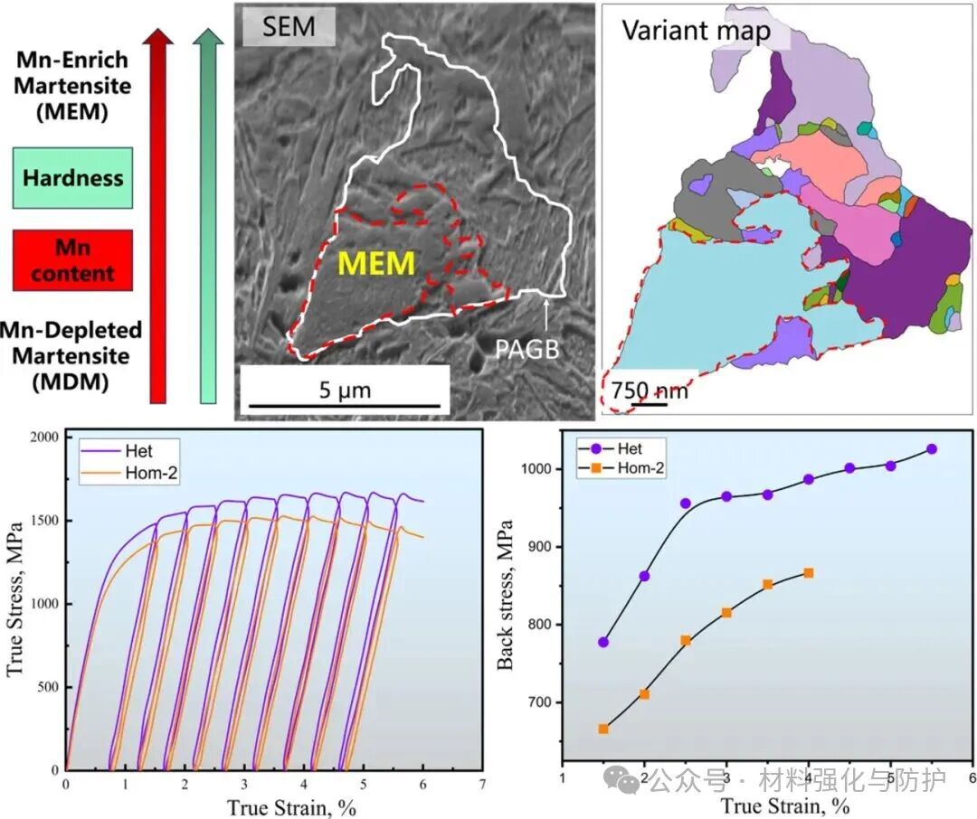 在该论文的研究中,团队证明了在低合金钢中,通过快速退火而引起的马氏体内的化学异质,可以使得钢材在不依赖残余奥氏体体的情况下,协同提高强度和塑性。团队研究发现,钢中了形成Mn贫化马氏体(MDM)与Mn富集马氏体(MEM)的共存结构,二者的取向差异在界面处产生大量几何必要位错(GNDs),并在拉伸过程中诱发持续的背应力硬化。因此,尽管残余奥氏体量很少(~2%),异质样品的力学性能仍超过其同质样品。这项工作证明,马氏体中内在的化学异质性可以实现出色的强塑性协同作用,为先进的高强度钢提供了一种无需依赖TRIP效应的简化替代方案。
