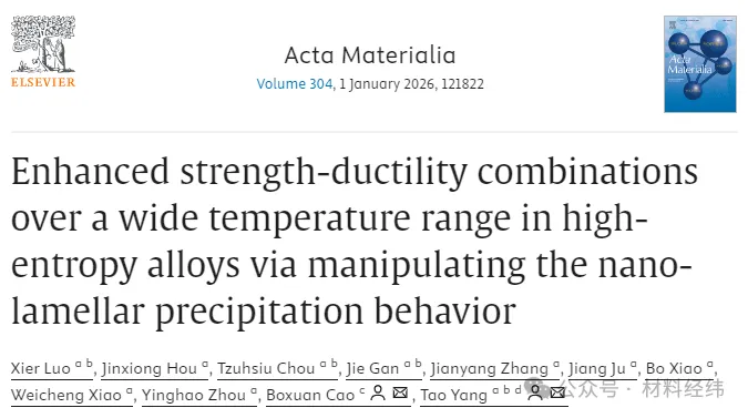 近期,香港城市大学杨涛教授一项发表于《Acta Materialia》的研究Enhanced strength-ductility combinations over a wide temperature range in high-entropy alloys via manipulating the nano-lamellar precipitation behavior,通过精巧的纳米层状析出相结构设计,成功开发出一种在室温至900°C宽温域内均展现卓越强塑性协同的高熵合金,为下一代高温结构材料指明了新方向。