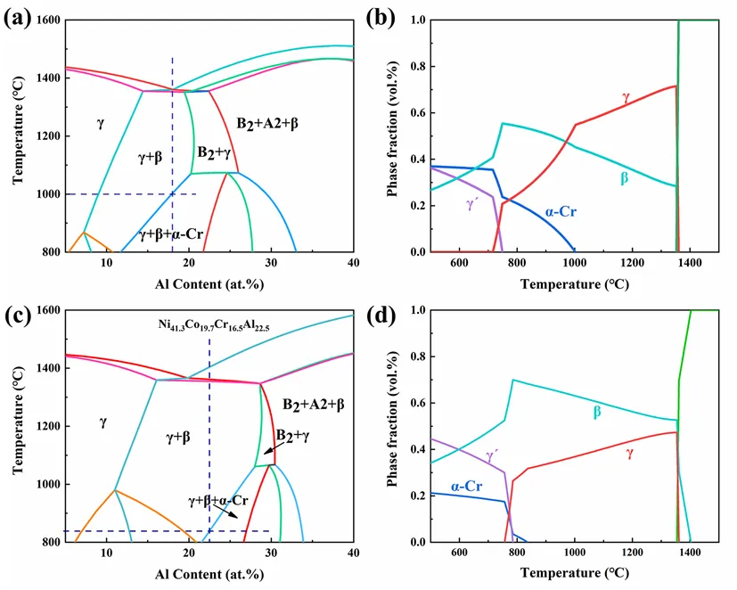 图1:共晶多主元合金的设计:(a) Ni50-xCo25Cr25Alx体系的伪二元相图;(b) 共晶多主元合金Ni32Co25Cr25Al18的平衡相随温度的分数;(c) 商用MCrAlY合金体系 Ni63.8-xCo19.7Cr16.5Alx的伪二元相图;(d) 商用MCrAlY合金 (Ni41.3Co19.7Cr16.5Al22.5)的平衡相随温度的分数。