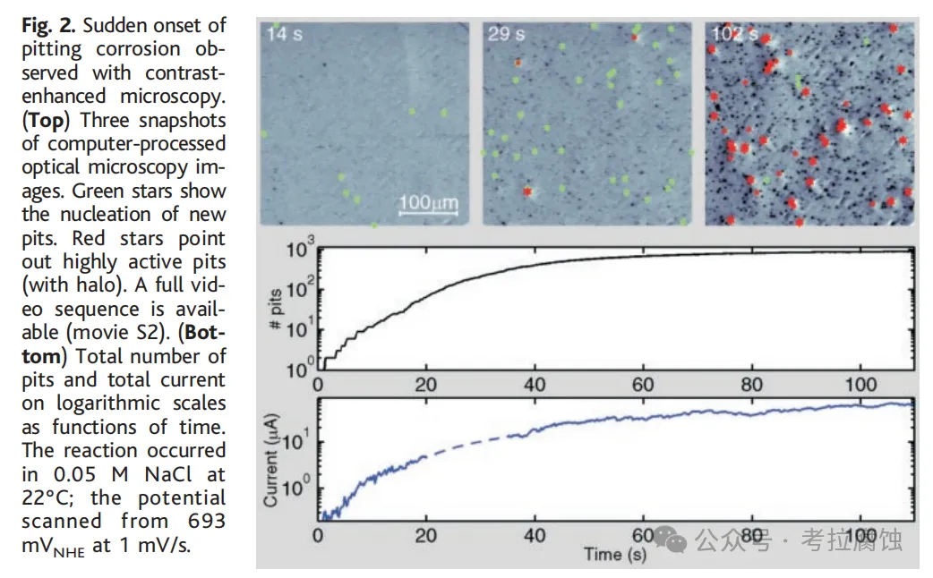 使用光学显微镜,我们监测了点蚀腐蚀的突然发作。图2显示了视频序列中的三个快照。图像已被计算机处理,以识别弱的、新出现的点蚀(绿色星)和被亮晕包围的高度活性点蚀(红色星)。表面上点蚀的总数量(活性或再钝化)作为时间函数显示。在腐蚀发作的前20秒,点蚀数量随时间指数增长,如对数尺度上的线性增加所示。在点蚀数量和电流指数增长期间,实验条件保持近似恒定,应用电位变化小于20 mV。在更长时间,总点蚀数量饱和在恒定水平。