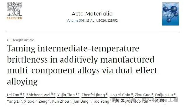 增材制造(3D 打印)技术凭借近净成形、成分设计灵活等优势,成为航空、石化、核电等高端装备制造领域的核心技术之一,而增材制造多组元合金因兼具优异的室温强韧性和高温抗氧化性,被视为下一代高温结构材料的重要候选。然而,中温脆性这一长期存在的难题,始终制约着这类合金在600-800°C 中温服役环境下的应用 —— 合金在此温度区间易出现塑性骤降、晶间脆性断裂,难以兼顾可靠的延展性和高强度,成为行业发展的关键瓶颈。