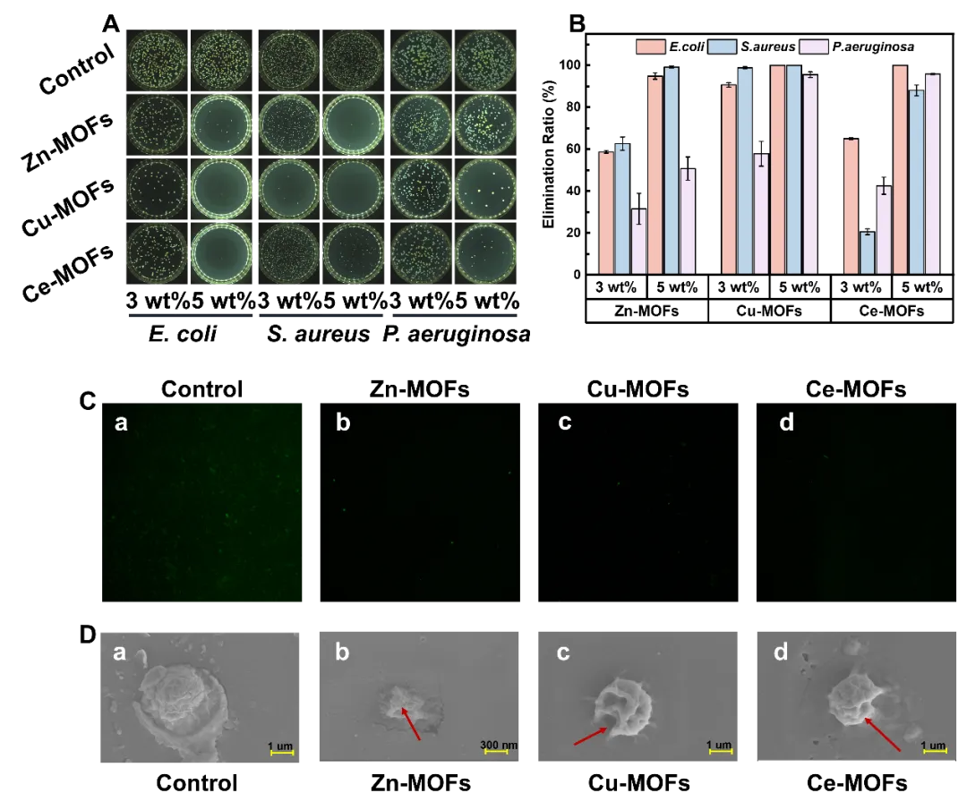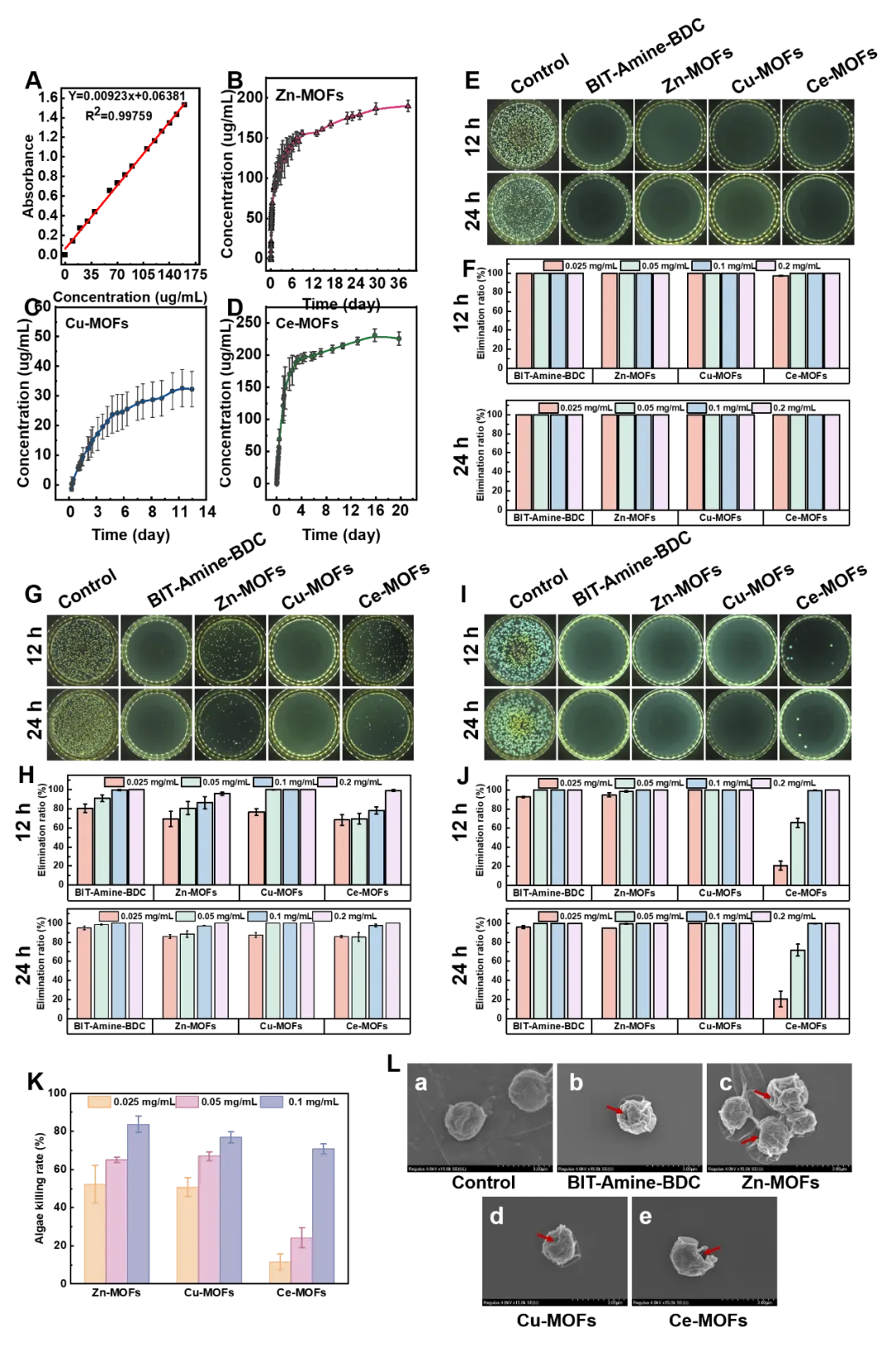 1. BIT-Amine-BDC 配体及 M-MOFs 的制备首先,通过Mannich反应,将商业化抗菌剂1,2-苯并异噻唑啉-3-酮(BIT)接枝到2-氨基对苯二甲酸上,合成具有本征抗菌活性的新型配体BIT-Amine-BDC。随后,将该配体分别与Zn²⁺、Cu²⁺、Ce³⁺金属离子进行溶剂热反应,自组装构建系列M-MOFs(M=Zn, Cu, Ce)抗菌材料。采用配体交换策略,将柱撑结构MOF材料ZU-901浸渍于广谱抗菌剂吡啶硫酮钠(SPT)溶液中。通过Cu-S配位键的作用,将SPT分子稳定封装于ZU-901骨架中,成功制得功能化MOFs抗菌材料ZU-901@SPT。1.M-MOFs(M:Zn、Cu、Ce)通过超声分散和机械混合与水性丙烯酸树脂混合,粉末质量比分别为0 wt%、3 wt%和5 wt%。2. PDMS基杂化涂层的合成步骤如下:将ZU901和ZU901@SPT超声处理30分钟以形成均匀悬浮液,将该悬浮液与羟基硅油混合并在室温下机械搅拌1小时,使填料在硅油相中均匀分散;随后依次加入正硅酸乙酯(TEOS)和有机锡催化剂(如二月桂酸二丁基锡,DBTL),严格控制羟基硅油、正硅酸乙酯与催化剂三者的质量比为90:10:1,填料添加量为最终复合材料总质量的3 wt%或5 wt%;将体系在室温下持续机械搅拌至混合均匀,随后在室温下固化24–48小时以保证其硬度。使用扫描电子显微镜(SEM)和透射电子显微镜(TEM)观察材料微观形貌与结构。通过X射线衍射(XRD)和X射线光电子能谱(XPS)分析晶体结构与元素化学态。采用紫外-可见吸收光谱(UV-vis)和傅里叶变换红外光谱(FTIR)评估光学性质与官能团变化。通过热重分析(TGA)和氮气吸附-脱附(BET)测定热稳定性与孔结构特性。采用抑菌圈法(ZOI)和最小抑菌浓度(MIC)评估抗菌活性,通过平板菌落计数计算抑菌率。利用扫描电镜(SEM)观察细菌形貌变化,采用结晶紫染色和激光共聚焦(CLSM)活/死染色分析抗生物被膜能力。通过藻抑制率测定和荧光显微镜评估抗藻性能。采用电子顺磁共振(EPR)检测活性氧生成。图 1 中的 ¹H NMR 和 FT-IR 光谱证实了 BIT 的成功修饰,随后利用该配体与 Zn²⁺、Cu²⁺、Ce³⁺三种金属离子配位,合成了相应的 Zn-MOFs、Cu-MOFs 和 Ce-MOFs,XPS 分析证实了金属离子与配体间的配位作用,N₂吸脱附曲线和 SEM/TEM 表征则揭示了 MOFs 的多孔结构和不同形貌(Zn-MOFs 呈层状堆积,Cu-MOFs 和 Ce-MOFs 为纳米颗粒),静电势(ESP)分布计算表明配体上带负电的羰基氧是优先与金属离子配位的位点。图1. BIT-Amine-BDC与M-MOFs(M:Zn、Cu、Ce)的表征结果。(A)¹H NMR谱图,(B) FT-IR光谱,(C) BIT-Amine-BDC与M-MOFs(M=Zn, Cu, Ce)的紫外-可见吸收光谱,(D) M-MOFs(M=Zn, Cu, Ce)的XRD衍射图谱,(E) BIT-Amine-BDC与M-MOFs(M=Zn, Cu, Ce)的XPS概览谱,(F) Zn 2p, (G) Cu 2p的高分辨XPS谱, (F) Zn 2p、(G) Cu 2p、 (H) Ce 3d 及 (I) O 1s 高分辨率光电子能谱,(J) M-MOFs (M:Zn, Cu, Ce)的N₂吸附-脱附等温线,(K) BIT-Amine-BDC的静电势分布图。图 2 A-D 释放实验表明 M-MOFs 能持续释放抗菌配体和金属离子,其中 Zn-MOFs 的累积释放周期长达 38 天,平板菌落计数法证实 Cu-MOFs 在 0.025 mg/mL 的低浓度下 12 小时内即可实现对大肠杆菌的 100% 杀灭,表现出最优异的抗菌性能,抗藻实验显示 0.1 mg/mL 的 M-MOFs 对小球藻的抑制率超过 70%。图2. BIT-Amine-BDC及M-MOFs(M:Zn、Cu、Ce)的长期体外抗菌活性评价。(A) 标准BIT-Amine-BDC的校准曲线(通过紫外-可见光谱测定);(B–D) 其从M-MOFs(M:Zn, Cu, Ce)中的释放曲线;(E, F) 含0.1 mg/mL BIT-Amine-BDC的培养基中,12小时及24小时培养的大肠杆菌菌落形成单位(CFU)计数BIT-Amine-BDC与M-MOFs(M:Zn、Cu、Ce)的释放曲线;(E、F)大肠杆菌、(G、H)金黄色葡萄球菌、(I、J)铜绿假单胞菌经12小时及24小时培养后的灭菌效率定量评估;(K)M-MOFs(M:Zn、Cu、Ce)处理藻类的杀灭率;(L)M-MOFs(M:Zn、Cu、Ce)处理藻类的扫描电子显微镜图像。图 3 涂层抗菌测试结果表明,添加 5 wt% M-MOFs 的杂化涂层在 4 小时内对大肠杆菌的杀灭率均超过 94%,其中 Cu-MOFs 和 Ce-MOFs 达到 100%,对金黄色葡萄球菌的杀灭率分别达到 99.1%(Zn-MOFs)、100%(Cu-MOFs)和 88.1%(Ce-MOFs),抗藻实验显示经 5 天浸泡培养后,5 wt% M-MOFs 杂化涂层表面的小球藻绿色荧光信号显著减弱,SEM 图像显示藻细胞出现明显的破裂和崩解,而空白对照组藻细胞形态完整,证实了杂化涂层优异的抗藻附着性能。图3. M-MOFs混合涂层(M:Zn、Cu、Ce)的抗菌与抗藻性能评估。(A) 菌落形成单位(CFU)计数与 (B)经M-MOFs混合涂层孵育后细菌灭菌效率的定量评估,(C) 共聚焦显微镜图像与 (D) 扫描电子显微镜图像显示小球藻与纯涂层及5 wt% M-MOFs防污涂层共培养5天后的状态。图 4 采用 L929 小鼠成纤维细胞,通过 CCK-8 法、Annexin V/PI 流式细胞术和活 / 死细胞染色激光共聚焦显微镜系统评估了 BIT-Amine-BDC 及 M-MOFs 的细胞相容性,CCK-8 结果显示材料对细胞的毒性呈现浓度依赖性,在 26 μg/mL 浓度下,Ce-MOFs 处理 24 小时后细胞存活率仍达 80%,表现出优异的生物相容性,而 Zn-MOFs 和 Cu-MOFs 在该浓度下细胞存活率降至 20% 左右,活 / 死细胞染色进一步证实在 13 μg/mL 浓度下,Ce-MOFs 处理组几乎观察不到红色荧光(死细胞),绿色荧光强度接近对照组水平,流式细胞术定量分析表明 13 μg/mL Zn-MOFs 处理组诱导了大量细胞晚期凋亡(Q2 象限 28%),而 BIT-Amine-BDC(5.34%)、Cu-MOFs(6.61%)和 Ce-MOFs(0.87%)对细胞凋亡的影响较小,三种 MOFs 的生物相容性顺序为 Zn-MOFs < Cu-MOFs < Ce-MOFs。综上所述,所制备的系列 M-MOFs 及基于其构筑的杂化涂层均展现出优异的抗菌与抗藻性能。图4. BIT-Amine-BDC及M-MOFs(M:Zn, Cu, Ce)的生物相容性评估。(A-D) L929细胞经不同浓度样品处理24小时后的