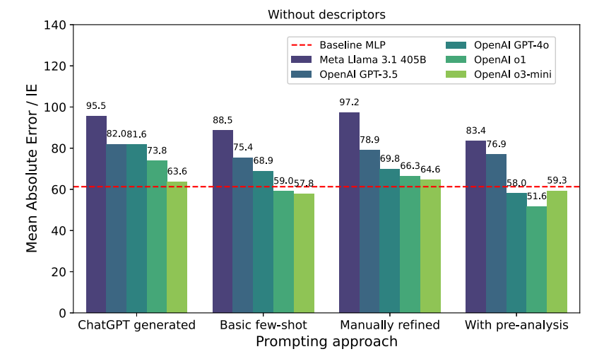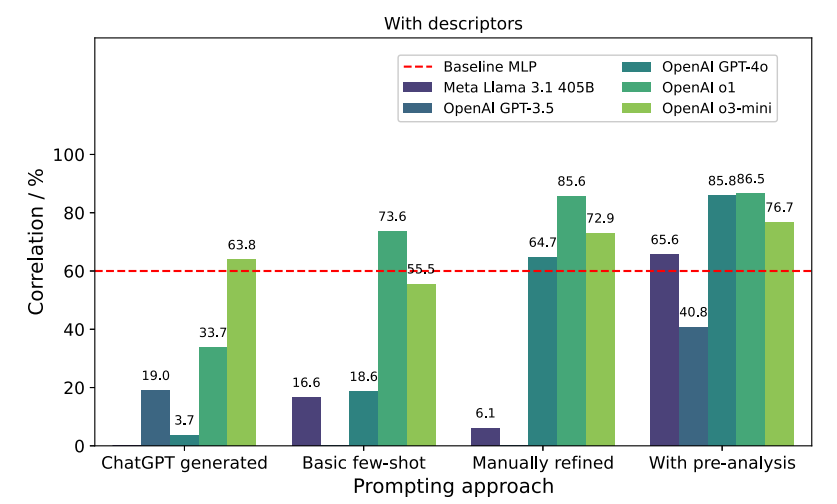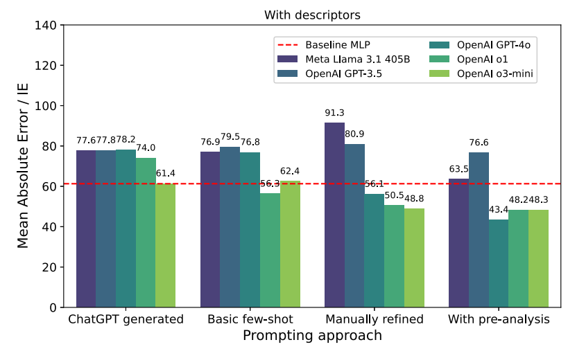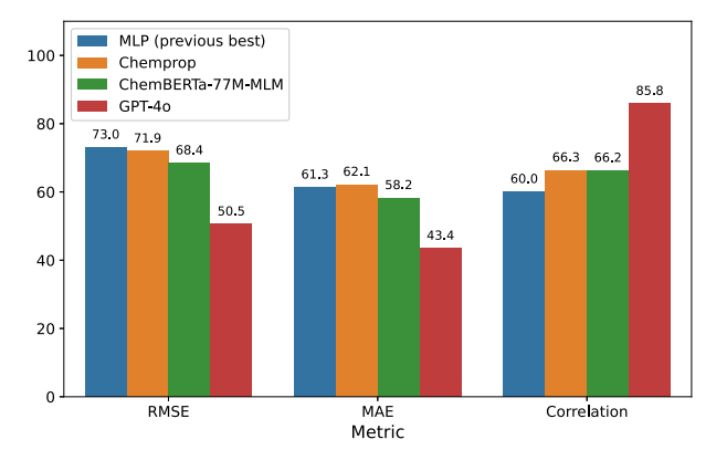 标题: Large language models predicting the corrosion inhibition efficiency of magnesium dissolution modulators DOI: https://doi.org/10.1016/j.corsci.2025.113080 工作亮点 一、方法创新:提出LLM 小样本预测框架,攻克镁合金缓蚀效率数据稀缺建模难题 首次将通用大语言模型(GPT‑4o/o1/o3‑mini)用于镁合金 ZE41 缓蚀效率预测,仅依托分子名称、SMILES 字符串与少量描述符即可完成建模,无需复杂特征工程;对比化学专用 LLM 与传统神经网络,依托大模型预训练化学知识实现上下文推理,在75 样本极小数据集下规避过拟合,突破腐蚀领域数据匮乏、传统模型依赖大规模标注数据的核心瓶颈。 二、性能突破:GPT‑4o 预测精度全面领先,小样本超越传统机器学习 基线在 RMSE、MAE、皮尔逊相关系数三大指标上,GPT‑4o 配合预分析提示 + 分子描述符输入实现最优表现,MAE 低至 43.4、相关系数达 85.8%,较传统 MLP 基线误差显著降低、相关性大幅提升;o1、o3‑mini 等推理型大模型对提示依赖性低,未优化 prompt 即可超越基线,在小样本化学腐蚀预测任务中实现性能跨越式突破。 三、价值创新:通用大模型赋能腐蚀材料筛选,建立低成本高效筛选新范式 无需针对腐蚀领域微调大模型,仅通过提示工程即可挖掘分子结构‑缓蚀性能关联规律;验证通用 LLM 在材料腐蚀领域的强泛化能力,大幅减少实验量与数据采集成本,形成 “分子信息输入 — 提示工程优化 —LLM 预测 — 候选剂筛选” 的轻量化流程,为镁合金缓蚀剂快速开发、有机腐蚀调节剂高通量筛选提供可落地、高效率的 AI 新范式。 图文解析 01 图1.不同评估指标下基线结果的概览。 MLP 结果引自Schiessler等人[38]的研究。相关性指标反映预测值与实验值之间的关联程度,数值越高表明结果越好(右图)。相反,误差指标 RMSE(中图)和MAE(左图)数值越低则表明性能提升。 02 图2.不同参数组合下ChemBERTa方法预测结果的平均绝对误差(MAE)概览。红色虚线表示我们前期研究中用于直接对比的 MLP 结果。 03 图3.通用LLM结果概览:未添加额外描述符输入时的平均绝对误差(MAE)。红色虚线表示用于对比的 MLP 结果。提示方法包括1种ChatGPT生成提示和3种人工编写提示策略。基础少样本方法未包含任何辅助步骤,而人工优化提示则包含这些步骤。预分析阶段指在预测步骤前预先对训练数据进行分析的提示方法。 04 图4.通用LLM结果概览:含附加描述符输入的平均绝对误差(MAE)。红色虚线表示用于对比的 MLP 结果。提示方法包括1种ChatGPT生成提示和3种人工编写提示策略。基础少样本方法未包含任何辅助步骤,而人工优化提示则包含这些步骤。预分析阶段指在预测步骤前对训练数据进行预先分析的4种提示方案。 05 图5.通用大语言模型(LLM)结果概览:与附加描述符输入的相关性分析。红色虚线显示用于对比的 MLP 结果。提示方法包括1种ChatGPT生成提示和3种人工编写提示策略。基础少样本方法未包含任何辅助步骤,而人工优化提示则包含这些步骤。预分析阶段指在预测步骤前对训练数据进行预先分析的4种提示方案。 06 图6.各组使用不同评估指标的最佳结果概览。 MLP 结果引自Schiessler等人[38]的研究。相关性指标反映预测值与实验值之间的关联程度,数值越高表明结果越好。反之,误差指标 RMSE 均方根误差(RMSE)和平均绝对误差(MAE)数值越低,则说明模型性能越优。 07 图7. 提示策略概述。除少数例外情况外,提示系统的工作原理类似于聊天界面:从顶部开始,当前提示前会以聊天记录形式附加历史提示与回答。该示意图展示了未添加描述符时的提示方案。当输入数据中添加描述符时,预分析提示将扩展为具有不同聚焦点的分析集合。