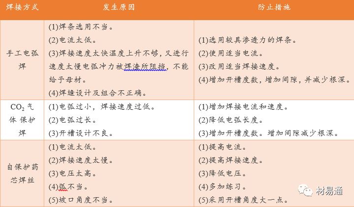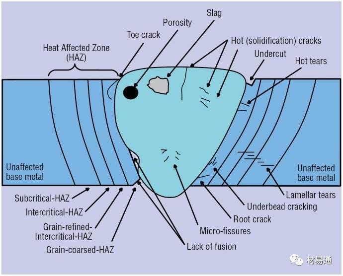 7.引起失效的常见缺陷 金属焊接缺陷 焊接缺陷的种类很多,按其在焊缝中所处的位置可分为外部缺陷和内部缺陷两大类。外部缺陷也叫外观缺陷。外部缺陷位于焊缝表面,借用肉眼或低倍放大镜就能观察到。内部缺陷位于焊缝的内部,必须应用破坏性检验或专门无损检验方法才能发现。 焊接缺陷分类 焊接区域示意图 焊缝尺寸不符合要求 焊缝尺寸不符合要求包括:焊缝外形高低不平、焊道宽窄不齐、焊缝余高过大或过小、焊缝宽度太宽或太窄、焊缝和母材之间的过渡不平滑等。 原因分析:(1)焊缝坡口角度、宽度及组装间隙不统一。(2)焊条直径选择不当,造成填充层过高,失去坡口轮廓线,使盖面宽窄不一,焊缝过高,波纹粗劣。(3)背面清根刨缝质量差,焊道宽度不一。(4)焊接电流过大或过小,运条手法和角度不当以及焊速不均匀。 危害性:尺寸过小的焊缝,会降低焊接接头的强度;尺寸过大的焊缝,不仅浪费焊接材料,也会增大焊接结构的变形。焊缝金属向母材的过渡处若不平滑,出现尖角,会造成应力集中,降低焊接结构的承载能力。 预防措施:(1)采用自动和半自动切割机或刨边机加工坡口。(2)焊缝组对间隙应控制在标准规范要求值以内,背面用碳弧气刨清根后,采用砂轮修整刨槽及碳化层,使刨槽宽窄一致。(3)选用适当的焊接电流和焊条直径,遵守焊接工艺,熟练掌握操作技术,保持焊速均匀;手工焊操作人员要熟练地掌握运条速度和焊条角度,以获得成形美观的焊缝。 咬边 咬边也称“咬肉”,是电弧或火焰将焊缝边缘的母材熔化后,没有得到填充金属的补充,而留下的凹陷或凹槽。咬边是一种危险的缺陷,它不但减小了基本金属的有效工作截面,而且在咬边处还会造成应力集中。咬边又是一种常见的缺陷,应该特别引起注意。 焊瘤 熔化金属流淌到焊缝以外未熔化的母材上形成金属瘤。该处常伴有局部未熔合,有时也称满溢。习惯上,还常将焊缝金属的多余疙瘩部分称为焊瘤。焊瘤处应力集中,还易伴生裂缝等缺陷;焊瘤也破坏了焊缝平整光滑的外形,管子内部的焊瘸,除降低强度外,还减小管道的有效截面,造成堵塞观象。 原因分析:(1)坡口边缘污物未清理干净;电流过大,熔池温度过高,使液体金属凝固较慢,在自重的作用下下坠而成;焊接速度太慢以及组对间隙太大等。(2)运条角度不当,操作不熟练。焊速过慢也极易产生焊瘤。 预防措施:(1)焊接前应彻底清理坡口及其附近的脏物;组对间隙要合适;选择适当的焊接电流和运条角度,熟练掌握操作技术,保持焊速均匀。(2)碱性焊条采用短弧焊接,极性反接。 弧坑 弧坑是焊接时,由于断弧和收弧不当,在焊道末端形成的低洼部分,表面低凹深度大于0.5mm以上。弧坑低于基本金属表面,降低了焊接接头的承载能力,而且弧坑内常伴有气孔、夹渣、微裂纹等缺陷。 弧坑是由焊缝熔池金属未填足,熄弧过快或电流过大(薄板时)而造成。预防措施:收弧过程中,焊条要在收弧处作短暂的停留或作回焊运条,使电弧不要突然熄灭、使焊条金属填满熔池。 飞溅 手工焊接时,在焊缝及其两侧母材上产生一般性飞溅和严重性熔合飞溅。一般性飞溅是手工焊接常见的焊接质量通病;但产生严重性熔合性飞溅,其危害甚大,它会增加母材局部表面淬硬组织,易产生硬化发生脆裂及加速局部腐蚀性等缺陷。 弧疤 电弧擦伤也叫弧疤或弧斑,多是由于偶然不慎使焊条或焊把与焊接工件接触,或地线与工件接触不良短暂地引起电孤,而在焊接工件表面留下的伤痕,形成许多小圆孔和凹坑。 电弧擦伤处由于电弧的短暂引燃与急速熄灭,冷却速度快,在易淬火钢及低温钢的工件上,会形成脆性淬硬组织,可能成为脆性破坏的起源点。在不锈钢等有耐腐蚀性能要求的工件上,电弧擦伤会成腐蚀的起始点,降低材料的性能。 原因分析:操作不慎,使焊条或焊把裸露部分与非焊接部位接触,短暂地引起电弧,将母材表面擦伤,形成许多小圆孔和凹坑。 预防措施:(1)精心操作,避免带电的焊条或焊把裸露部分与非焊接区域母材相碰引起电弧。(2)不得在非焊接部位随意引弧或试电流,引弧应在引弧板上或在焊道破口内进行。(3)地线与母材应紧固良好。 气孔 气孔是焊接熔池中气体在凝固时未能逸出,而残留在焊缝中所形成的空穴。根据孔穴产生的部位,可分为外部气孔和内部气孔;根据分布情况,气孔又可分为单个气孔、连续气孔和密集气孔等。存在于焊缝内的气孔,减小了金属的有效截面,从而使焊接接头的强度降低;气孔的边缘可能发生应力集中,密集气孔使焊缝组织疏松,使接头的塑性降低;贯通性气孔破坏了焊缝的致密性,造成渗漏。焊缝中的氢气孔还有可能导致裂缝的产生和扩展。 夹渣 夹渣是焊后残留在焊缝中的熔渣,有的夹在焊缝内部,有的夹在表面沟槽内。 焊缝中的夹渣,降低了接头的承载能力,容易引起应力集中;影响了焊缝金属的致密性,还可能造成焊缝的渗漏,由于夹杂物与焊缝金属的线膨胀系数相差悬殊,温度剧烈变化时,有可能产生较大应力而导致裂缝。 未焊透 未焊透是焊接时接头根部未完全熔化而留下的间隙的现象。 未焊透降低了接头的机械性能,同时由于未焊透部位的缺口及末端会产生严重的应力集中,导致产生裂缝。 未熔合 未熔合是指焊缝金属和母材之间或焊道金属和焊道金属之间未完全熔化和结合的部分,它可以分为侧壁未熔合、层间未熔合和焊缝
