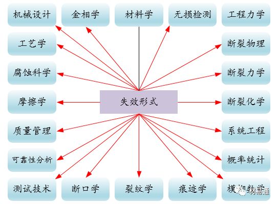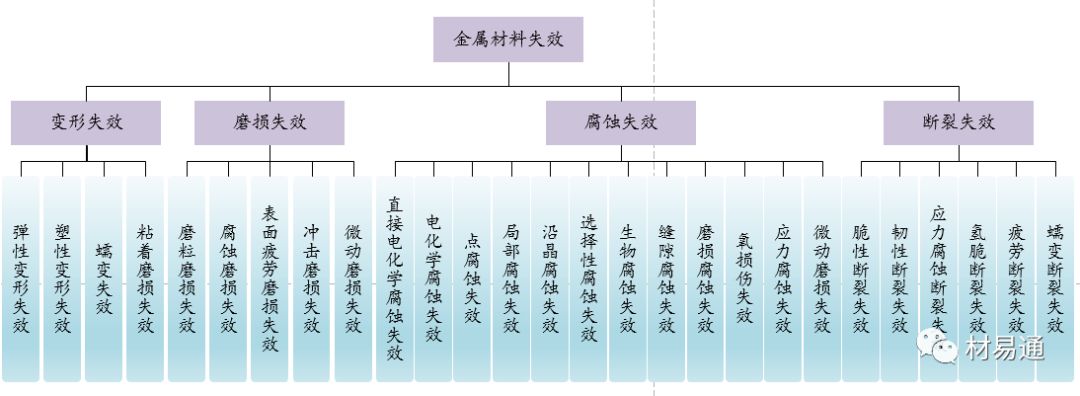 失效形式的分类 弹性变形失效: 当应力或温度引起材料可恢复的弹性变形大到足以影响装备正常发挥预定的功能时,就出现弹性变形失效。 塑性变形失效: 当受载荷的材料产生不可恢复的塑性变形大到足以影响装备正常发挥预定的功能时,就出现塑性变形失效。 韧性断裂失效: 材料在断裂之前产生显著地宏观塑性变形的断裂称为韧性断裂失效。 脆性断裂失效: 材料在断裂之前没有发生或很少发生宏观可见的塑性变形的断裂称为脆性断裂失效。 疲劳断裂失效: 材料在交变载荷作用下,经过一定的周期后所发生的断裂称为疲劳断裂失效。 腐蚀失效: 腐蚀是材料表面与服役环境发生物理或化学的反应,使材料发生损坏或变质的现象,材料发生的腐蚀使其不能发挥正常的功能则称为腐蚀失效。腐蚀有多种形式,有均匀遍及材料表面的均匀腐蚀和只在局部地方出现的局部腐蚀,局部腐蚀又分为点腐蚀、晶间腐蚀、缝隙腐蚀、应力腐蚀开裂、腐蚀疲劳等。 磨损失效: 当材料表现相互接触或材料表面与流体接触并作相对运动时,由于物理和化学的作用,材料表面的形状、尺寸或质量发生变化的过程,称为磨损。由磨损而导致构件功能丧失,称为磨损失效。磨损有多种形式,其中常见粘着磨损、磨料磨损、冲击磨损、微动磨损、腐蚀磨损、疲劳磨损等。 金属材料失效具体形式 3.失效原因分析