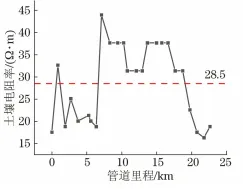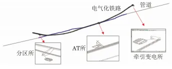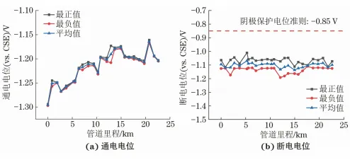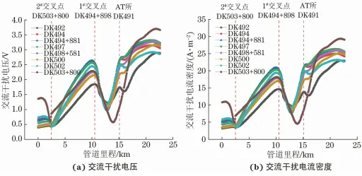 随着国民经济的快速发展,能源和轨道交通运输的发展也步入了快速发展阶段。截至2022年底, 我国长输油气管网总里程约18万km,全国铁路营业里程达15. 5万km,其中高速铁路里程达4. 2万km。至2025年,全国省区市成品油、天然气主干管网全部连通;远期展望到2030年,铁路网里程将达到20万km左右,其中高速铁路里程达4.5万km左右。受地理条件和成本限制,电气化铁路和油气管道往往铺设在同一条公共交通走廊上,这种现象在能源和轨道交通需求旺盛的地区更为凸显,两者分布趋于密集,导致一定范围内管道出现交叉穿越或近距离伴行的问题,埋地管道受到电气化铁路交流杂散电流干扰,管道交流腐蚀风险增大,国内外已相继报道了多起交流干扰案例。受并行电气化铁路交流干扰影响,加拿大一条天然气管道发生了交流干扰腐蚀穿孔、泄漏事故;德国某聚乙烯涂层管道出现两处异常交流干扰腐蚀。在我国,早在1984年就有报道:成品油管道受并行的宝成铁路交流干扰影响,管道交流干扰电压达37V;秦沈客运专线、京沪高铁、运煤铁路干线电气化铁路对周边临近管道产生的交流干扰电压分别达167,46. 7,60V。交流电气化铁路对管道交流干扰问题日益突出,得到了从业者的密切关注。为降低管道交流干扰风险,相关标准均指出,管道周边出现新的交流干扰源时,应开展交流干扰安全评估。 为评估电气化铁路对管道交流干扰影响的风险,现国内外主要采用公式解析法或数值模拟的方法。公式解析法将干扰系统中管道和干扰源等效为不同电器元件,并构建等效干扰电路,基于电场理论推导出干扰模型简化计算公式进行求解。目前公式解析法多以单一干扰机制(或阻性耦合或感性耦合)建立模型,存在适用性局限问题;过度简化干扰模型的计算参数,导致计算结果精度低,模型无法处理复杂情况等问题。而有限差分法、有限元法和边界元法等数值模拟方法可通过求解麦克斯韦方程组(感性、容性耦合) 和拉普拉斯方程组 (阻性耦合),利用迭代计算获得复杂工况下干扰区域的电、磁场分布。目前,数值模拟技术为复杂情况下管道交、直流干扰评估与缓解设计提供了有效解决途径并得到了广泛应用。 某新建快速铁路与已建天然气管道在空间上存在多处交叉和近间距并行,为确保新建铁路工程顺利建设,同时掌握管道受新建电气化铁路交流干扰的风险,保障管道运行安全,笔者对该天然管道开展了现场干扰检测,基于检测结果,利用专业电磁干扰数值模拟软件SESCDEGS评估了新建铁路对管道交流干扰的影响规律,并设计了干扰缓解措施,相关工作可为同行提供一定的借鉴和参考。 1 背景简介 我国电气化铁路采用单相工频交流供电制式,接触网额定电压为25kV,牵引供电示意如图1所示。铁路牵引变电站接外高压输电线路供电、降压,列车受电弓经接触网引流供给列车,电流再经钢轨、大地和回流线返回牵引变电站。钢轨与大地无法实现完全绝缘,机车运行时部分牵引电流经钢轨泄入大地,对管道形成阻性耦合干扰;钢轨回流电流小于接触网牵引供给电流且两者电流方向相反,两电流对管道形成感性耦合干扰。铁路牵引系统对临近埋地钢质管道交流干扰表现为钢轨入地杂散电流的阻性耦合和牵引/回流不平衡电流的感性耦合,电气化铁路对管道交流干扰机理示意见图1。 图1 电气化铁路牵引供电系统及其对管道交流干扰示意 铁路牵引供电形式不同,其对管道干扰原理一致,但干扰规律存在差异。本文中新建铁路正线采用自耦变压器(AT) 供电方式供电,AT供电方式的原理如图2所示。采用AT供电方式时,牵引线路每隔一定间距(约10km) 设置一台绕组比为1∶1的自耦变压器并安装于AT所内,自耦变压器并联于接触网与正馈线之间且中性点与钢轨相接。列车运行时,牵引电流经牵引变电站流出与距列车最近的AT所的正馈线形成一次高压侧回路,经AT所自耦变压器降压后二次低压侧回路电流为I且经钢轨回流,高压侧回路电流为I/2。AT供电方式下,高压侧回路中接触线与正馈线间电流大小相等、方向相反且两者间距小,高压侧回路铁路牵引供电系统对临近管道不平衡电流约为0,区段范围内管道受交流干扰小;二次低压侧回路中管道受钢轨泄漏杂散电流阻性耦合和接触网供给电流/钢轨回流间不平衡电流感性耦合综合影响,区段范围内管道存在交流干扰风险。AT供电方式下,管道受电气化铁路牵引系统干扰主要源于二次低压侧范围内回路,干扰大小受列车位置、AT所间距、管道与铁路相对间距和并行长度等因素影响。 图2 AT供电方式的工作原理示意 新建铁路线路全长84.943km,铁路正线牵引网采用AT供电方式。铁路线路于DK479+250处设置牵引变电所1座,于DK491设置AT所1座、于DK506+230处设置分区所1座。间距小于1 km公共走廊内新建铁路线路与已建管道空间相对关系详情见表1,相对位置如图3所示。 表1 管道与干扰源相对位置 图3 管道与电气化铁路线路相对位置示意 2 模拟参数与现场测试 2. 1 数值模拟参数 为建立准确的电气化铁路对邻近埋地管道交流干扰计算模型,对相关信息进行了收集整理。 (1) 土壤结构 采用Wenner四极法对公共走廊区域内管道沿线土壤电阻率进行了测试,土壤深度为2.5m。测 试结果如图4所示,公共走廊区域土壤电阻率平均值为28.5Ω·m。SESCDEGS软件无法对管道沿线 设置不同土壤结构,为综合评估涉及公共区域管道 受