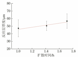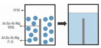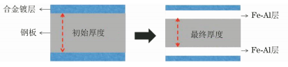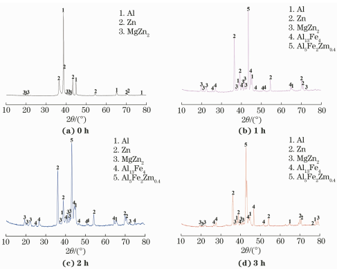 为满足汽车及家电领域产品在防腐蚀性能方面的要求,钢铁表面热浸镀锌系列产品也随之得到发展,从传统的镀锌、合金化镀锌发展到如今的镀锌铝、镀锌铝镁等系列产品。根据镀层成分,目前世界范围内锌铝系镀层产品大致可以分为低铝、中铝、高铝三类。镀层产品中的镁质量分数为1%~3%,其作用主要是提高镀层的耐蚀性。其中高铝系锌铝镁合金镀层产品中加入了一定量的硅,以防止镀液与基体之间发生剧烈反应。 高铝系热浸镀层钢板产品因其良好的耐大气腐蚀和耐高温性能,被应用于家电、建筑等领域。在热浸镀过程中,钢板与合金熔液中间会生成一层Fe-Al反应层,起到连接基体与镀层的作用。此反应层的硬度和脆性相较于基体都有所提高,但过厚的反应层会导致镀层在加工成型过程中脱落的倾向增大。此外,热浸镀过程中发生的漏镀、镀层结合性差等质量缺陷也与此反应层的形成有着密切关系。目前,对于热浸镀高铝系合金镀层的研究多集中于热浸镀工艺、镀层组织与各项性能之间的关系,对于基体与镀层之间反应层的生长过程的研究却很少。 笔者采用Fe/Zn-55%Al-1.2%Mg-1.6%Si扩散偶,研究了高铝系锌铝镁合金固液界面Fe-Al反应层的生长规律,以期为有效控制高铝系合金镀层组织结构及稳定其成形性能提供重要的参考及指导。 1 试 验 1. 1 试验材料 采用热镀锌模拟器预制的薄反应层高铝系Zn-55%Al-2%Mg-1.6%Si合金镀层作为目标扩散偶的材料。以冷轧薄钢板DX51D为基材,试样尺寸为300mm×200mm×0.8mm,成分(质量分数)为:0.049%C、0.2052%Mn、0.0256%Si、0.0035%S、0.0157%P、0.001%Ti、0.039% Al、余量为Fe。 1.2 预处理 依次用200号、500号及1000号砂纸打磨试样表面,然后用酒精、NaOH溶液以及蒸馏水对表面进行清洁、除油。 采用热镀锌模拟器进行热浸镀试验,钢板在经过前处理后进行退火处理,退火温度为730℃,退火时间为3min,退火处理过程中通入N2+H2保护性气体,以防止钢板氧化。 经退火处理后,对钢板进行热浸镀试验,锌锅温度控制在600℃左右,热浸镀时间为5s,镀层总厚度为40μm左右,待钢板表面镀层凝固成形后备用。 1.3 扩散偶制备 图1为Zn-55%Al-2%Mg-1.6%Si固液扩散偶示意。固液扩散偶的制备流程如下:将装有Zn-55%Al-2%Mg-1.6%Si合金液的坩埚置于加热炉内,并将其加热到600℃使其熔化,待达到设定温度后将预制好的镀层钢板置于坩埚内的合金液中,并继续维持炉温在600℃,扩散时间设定为1, 2, 3h。在达到扩散时间后取出合金镀层钢板使其冷却,沿合金镀层钢板中心线切取块状试样进行微观形貌表征。利用FEI-InspectF型扫描电镜(SEM) 及其配备的能谱仪(EDS)分析扩散界面的微观形貌及元素扩散分布,采用D/MAX-RA型X射线衍射仪(XRD)分析反应层的相组成。 图1 Fe/Zn-55%Al-2%Mg-1.6%Si扩散偶示意 2 结果与讨论 2.1 Fe-Al反应层微观形貌 图2为扩散不同时间后Fe/Zn-55%Al-2%Mg-1.6%Si扩散偶中Fe-Al反应层的截面SEM形貌。可以看出,扩散偶分为三部分,最底层为铁基体 , 中间为 Fe-Al反应层 ,最外层为 Al-Zn-Si-Mg合金层。当扩散时间为0h时,扩散界面的反应层非常薄,难以与合金液相镀层相区别。整个镀层界面几乎被合金液相层占据,合金液相层呈现明显的枝晶状显微结构。当扩散时间为1h时,Fe-Al反应层的厚度约为40μm,且其与合金液相层的边界呈凹凸不平的波浪状,这说明Al元素在向基体方向扩散的时候受合金液热量动态分布的影响,界面各处扩散速率不相一致;而钢板一侧的扩散界面比较平整,说明钢板一侧Fe元素的扩散速率在整个界面基本一致。当扩散时间为2,3h时,随着扩散时间的延长,Fe-Al反应层的厚度依旧维持在50μm左右,相比于扩散1h的反应层厚度没有明显变化,说明Fe、Al元素在后期的互扩散变得非常缓慢。这可以运用扩散理论进行解释:在扩散初期,Fe、Al元素在浓度梯度的作用下扩散速率较快,反应层在扩散初期(1h) 增长较迅速;随着扩散时间的延长,反应层中逐渐形成了Fe-Al金属间 化合物,高温下稳定的金属间化合物晶体结构封 闭了元素扩散的 “液体通道”,所以扩散后期反应层生长相对滞缓。 图2 扩散不同时间后Fe/Zn-55%Al-2%Mg-1.6%Si扩散偶中Fe-Al反应层的截面SEM 形貌 2.2 Fe-Al反应层物相组成 图3为扩散不同时间后Fe/Zn-55%Al-2%Mg-1.6%Si扩散偶中Fe-Al反应层的XRD谱。可见,扩散偶初始结构中仅有合金液相镀层,此时Fe-Al反应层极薄,仅检测到合金液相镀层中的富Al相、富Zn相及MgZn2相。有研究结果显示,合金液相镀层中还应该有Mg2Si相,本研究中没有检测到该相,这可能是因为Mg2Si相的含量较低。随着扩散时间的延长,扩散偶XRD谱中出现了Al13Fe4相及Al5Fe2Zn0.4相的衍射峰,这说明Fe-Al反应层主要由Al13Fe4相及Al5Fe2Zn0.4相组成。然而,在扩散偶中并未检测到含Si物相,故Si在扩散偶中的存在形式有待进一步探究。 图3 扩散不同时间后Fe/Zn-55%Al-2%Mg-1.6%Si扩散偶中Fe-Al反应层的XRD谱 2.3 扩散偶中元素迁移过程 为探究Fe/Zn-55%Al-2%Mg-1.6%Si扩散偶中的元素迁移过程,对扩散1h后的反应层进行了EDS面扫分析,结果如图4所示。可以看出,反应层的生长过程主要涉及Fe、Al、Zn、Si四种元素,而面扫描并未检测到Mg元素,说明扩散偶中的Mg不参与反应层的扩散过程,这与扩散偶中反应层的XRD谱中无含Mg物相衍射峰相印证。由图4还可见:扩散1h后Fe-Al反应层出现了“分层结构”,其中Al、Fe是扩散迁移过程的主要参与元素,故其在浓度梯度的作用下分布于整个扩散层中;Zn及Si仅