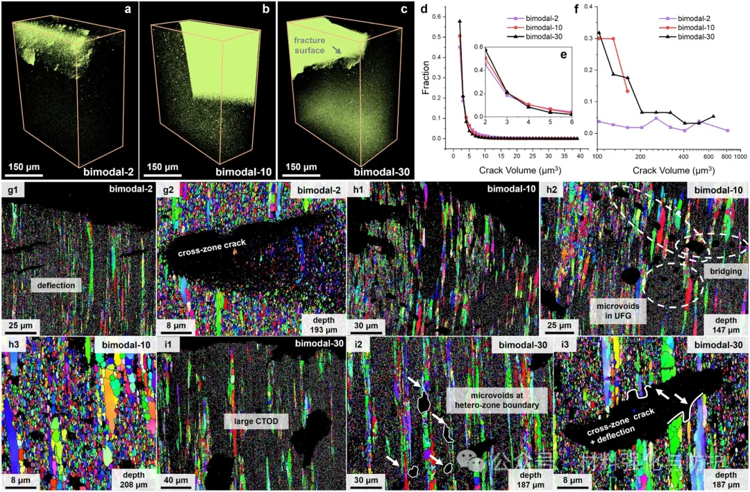 3D-XRM与EBSD显示,bimodal-10在大应变下异质区界面保持良好结合,微空洞在UFG区内分散而非集中于界面,从而延缓了界面失效并保持HDI硬化至约9%应变。相比之下,bimodal-2和bimodal-30分别出现端部应变集中及界面微空洞集中,导致提前颈缩与裂纹贯穿。