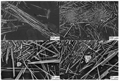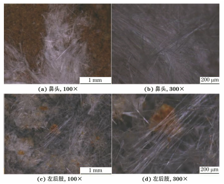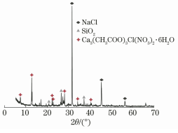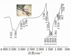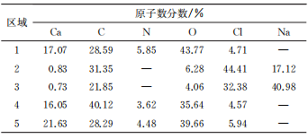 1 试 验 1. 1 试 样 清素三彩釉陶狮子现藏于河北博物院,存放在库房的木质囊匣中。器物整体结构完整,陶胎质地,表面施黄、蓝釉,通体高34cm。由图1可见:器物表面有一层玻璃态蓝色釉层,釉层在烧制过程中出现较为明显的开片,狮子鼻头部位损坏尤为严重,絮状结晶物大量析出,撑破了胎体结构,导致胎体开裂脱落,左后肢外侧、尾巴等部位均出现明显的釉层脱落,器物表面局部位置如腹部析出大量肉眼可见的白色絮状结晶盐,器物整体外观形貌受到严重损害。 图1 清素三彩陶狮的整体及局部照片 1.2 试验方法 选用Smartzoom5超景深视频显微镜(OM) 观察试样的表面形貌。测试条件设定为原位观察,以最大程度保留样品的原始状态,避免因样品转移等操作对观察结果产生干扰,从而获取最真实的微观形貌信息。 采用配备了先进LYNXEYEXE-T探测器的布鲁克BrukerD8Advance X射线衍射仪(XRD) 对试样表面的物相进行分析。测试条件为:电流40mA,电压40kV,扫描范围3°~70°。 采用配有OxfordX-Max50能谱仪的FEIQuanta 650FEG场发射环境扫描电子显微镜(SEM-EDS)对试样进行微观分析,为了提高试样的导电性和清晰度,在其表面喷镀一层厚15~20nm的金膜,喷金后在高真空模式下进行微观形貌观察和化学元素分析,加速电压20kV,工作距离10mm,能谱分析时采集时间约为60s。 采用HORIBA LabRam HR800 Ev共焦显微拉曼光谱仪确定试样中物质的分子结构和成分。采用50×物镜,采集时间60s,累积2次,光栅1800,仪器分辨率2cm-1。采用单晶硅片校准,光谱测试范围50~3800cm-1;搭配473nm激光。 采用NicoletiN10MX傅里叶变换显微红外光谱仪(Micro-FTIR) 鉴定试样的化学成分。测试条件设定为透射模式,测量范围为675~4000cm-1,分辨率为8cm-1,扫描次数16次,采集时间3s。 2 结果与讨论 2. 1 超景深显微镜观察 取陶狮脱落的鼻头陶胎放置在超景深视频显微镜下进行观察。由图2可见浅黄色的釉陶本体和白色绒毛状的结晶盐,进一步放大可见白色绒毛状结晶盐由极为细小的白色针状物组成;左后肢釉层表面的白色针状结晶盐主要呈现不规则的簇状或平行的纤维状聚集形态,直径约为1μm,长度可达几百微米,甚至在部分区域能够达到1~2mm,这种特殊的微观形貌为后续分析结晶盐的形成机制提供了重要线索。 图2 陶狮不同部位表面白色结晶盐的微观形貌 2.2 X 射线衍射分析 利用布鲁克 BrukerD8 AdvanceX射线衍射仪对陶狮左后肢脱落釉层表面附带的白色绒毛状结晶盐(样品 1 号) 的主要化学成分进行检测 分析,结果表明其含有37%( 质 量 分 数,下 同) Ca3 (CH3COO)3Cl(NO3)2· 6H2O、46%NaCl和17%SiO2,见图3。其中,有机酸钙盐Ca3(CH3COO)3Cl(NO3)2·6H2O的形成机制较为复杂,它是由挥发性有机酸与陶胎中的可溶性盐发生化学反应形成的,在国外被称为Thecotrichite。WAHLBERG等采用多种先进 的分析方法,对Thecotrichite的分子式进行了精确确认,最终确定为Ca3(CH3COO)3Cl(NO3)2·6H2O。吴娜等 在研究“汉并天下”瓦当表面结晶盐的成分时也发现这种有机酸钙盐。 图3 白色结晶盐的X射线衍射谱图 2.3 扫描电镜-能谱分析 由图4可见:结晶盐主要呈现针状聚集态,这与文献报道的Ca3(CH3COO)3Cl(NO3)2 ·6H2O形貌一致;继续放大可见除了针状聚集态,还出现少量块状形态(见位置2和3),放大1000倍后可见块 状结晶盐呈不规则形状。 由表1可见:针状聚集态结晶盐(位置1) 主要由Ca、C、N、O、Cl组成,推测主要为有机酸钙盐Ca3(CH3COO)3Cl (NO3)2·6H2O;呈现不规则块状的结晶盐(位置2、3) 主要含有Cl、Na、C元素和少量Ca、O元素,推测其主要为氯化钠,可能含有微量碳酸钙。SEM-EDS结果进一步验证了结晶盐中NaCl的存在。 图 4 白色结晶盐的SEM形貌及能谱位置 表1 白色结晶盐的能谱分析结果 2.4 激光共聚焦显微拉曼光谱分析 为了进一步验证析出物中有机酸钙盐的存在,采用激光共聚焦显微拉曼光谱对白色絮状结晶盐进行拉曼光谱检测。取陶狮左后肢脱落釉层表面附带的白色绒毛状结晶盐进行试验,由图5可见,白色针状结晶盐拉曼谱图中特征峰的拉曼位移与文献报道的Ca3 (CH3COO)3Cl(NO3)2·6H2O的拉曼谱图一致。更加验证了XRD的分析结果,确认白色针状结晶盐中存在有机酸钙盐 Ca3(CH3COO)3Cl(NO3)2·6H2O。 图5 白色结晶盐的拉曼光谱图 2.5 傅里叶变换显微红外光谱分析 如图6所示,1535cm-1、1481cm-1、1403cm-1处的吸收峰来源于乙酸根中C=O键的伸缩振动,1361cm-1、1049cm-1、1014cm-1处的吸收峰主要因乙酸根-CH3基团中C-H键的弯曲振动产生,960cm-1处的吸收峰由乙酸根中C-C键的伸缩振动引起,744cm-1处的吸收峰由C-O键的弯曲振动产生;3521~3344cm-1间出现的宽峰是由于结晶水中O-H键的伸缩振动、1639cm-1处是结晶水中O-H键弯曲振动产生的吸收带;1388cm-1和817cm-1处是NO3的特征吸收峰。红外光谱图进一步印证了白色绒毛状析出物中含有有机酸钙盐,这为全面了解结晶盐的化学结构和性质提供了重要依据。 图6 白色结晶盐的红外光谱图 2.6 讨论 拜恩最早在贝壳等碳酸盐物体上发现有机酸对博物馆藏品的腐蚀,物体表面呈现一层类似白色霜物质,这种腐蚀病害称为“拜恩病”。这种白色霜类物质均为有机酸钙盐,回顾以往有关有机酸钙盐的报道,其分子组成复杂多样,通常需采用 多种 检 测 方 式 相 互 佐 证 确 定。早在1997年,GIBSON等在存放在木质橱柜中的埃及石灰石浮雕上发现一种直径为3μm、长2cm的纤维状晶体,通过多种分析方法对结晶盐进行分析检测,并将其称作“thecotrichite”,