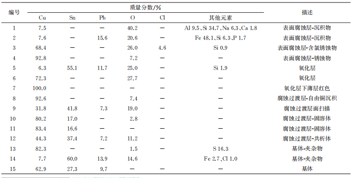 张予南等对比研究了17面汉代铜镜(出土于安吉上马山和临淄) 的腐蚀现象,发现不同埋藏环境中铜镜的腐蚀特征差异较大。上马山铜镜表面类似黑漆古,铜镜本体中α相优先腐蚀;临淄铜镜腐蚀严重,表面腐蚀产物为Cu2O和二价铜的碱式矿化物,铜镜本体中(α+δ) 相优先腐蚀。SARAIVA等对考古出土高锡青铜编钟的微观腐蚀结构进行了研究,发现埋藏或保存环境差异会导致不同的腐蚀模式。邹非池等对四川地区出土青铜器的选择性腐蚀现象及特征进行了分析,并发现了Cu2O与锡腐蚀产物、Cu2O与Cu2(OH)2CO3相互交替的“周期锈蚀现象”。张凯等运用电极电位差的理论对某高铅锡青铜工具中相的选择性腐蚀进行了探讨,指出电极电位较低的相会优先腐蚀。近年来,关于青铜器中自由铜沉积的现象屡有报道,对于自由铜的形成机理存在多种推测, 主要包括电化学腐蚀机理、反合金作用及α相的扩散相变理论等。基于铜镜本体与腐蚀特征研究的科学修复,是文物保护的有效保障。郑利平研究了重庆地区出土的明代铜镜,发现其表面酥粉锈主要为块铜矾,是重庆地区酸性大气环境中SO2侵蚀的产物。赵紫轩等将张家界市博物馆馆藏“漆古”铜镜按照残损情况划分为四类,系统阐述了四类铜镜的保护修复技术。马立治分析了我国古代铜镜的材质和形制特点,通过力学分析揭示其损坏机理,进而提出修复工艺的优化方案及关键实施步骤。 铜镜的腐蚀特征主要受铜镜本体制作工艺和出土环境影响,笔者采用X射线探伤仪、扫描电镜及能谱仪、金相显微镜及拉曼光谱仪等手段分析了保存于陕西历史博物馆的唐代瑞兽纹铜镜的本体及腐蚀产物,并在此基础上提出了科学可行的保护修复对策。 1. 1 试 样 该唐代瑞兽纹铜镜出土于陕西省西安市西郭(国五)M492墓地,现保存于陕西历史博物馆文物库房(详见图1)。该件瑞兽纹铜镜为圆形、直径10.6cm。厚 0.2 cm,镜缘宽2cm、厚1.0cm。铜镜破碎为五块,中间缺失一块,长期受埋藏和保存微环境影响,表面形成了多层腐蚀产物,可见绿色、浅绿色等锈蚀产物及泥土沉积物。采用原位无损分析结合局部碎片样品包埋后分析,研究铜镜基体及锈蚀特征。整个分析过程遵循“最小干预原则”,取样以不影响铜镜原貌及后期修复为前提。 图1 唐瑞兽纹铜镜宏观形貌 1.2 试验仪器及测试条件 采用超景深显微镜(KEYENCE VHX-600E)对铜镜表面形貌进行原位观察。 采用便携式X射线探伤仪Flatscan 27对铜镜内部缺陷进行检测,检测条件为管电压160kV,工作电流0.5mA。 在铜镜断裂处且不影响后续修复的部位取碎片样品包埋,依次采用500、1000、2000号砂纸打磨试样,然后用细绒布抛光,最后用3% (质量分数) FeCl3酒精溶液侵蚀,采用金相显微镜(奥林巴斯BX53M) 观察其微观组织和腐蚀情况。 采用美国PHENOM XL扫描电镜及能谱仪测试铜镜表面腐蚀产物成分,检测条件为加速电压15kV,工作距离5mm,高真空条件,探头模式为背散射。 采用法国Jobin Yvon(LabRAM HR Evolution)拉曼光谱仪对铜镜表面锈蚀物进行表征。检测条件为固体激光器(最大功率50mW),能量设定为最大功率的3.2%~5%,光栅600刻线,光斑尺寸1μm,物镜50×长焦,采集时间3~5s,累积次数2~5次,光谱采集范围100~4000cm-1。 2. 1 超景深显微观察 由图2可见,镜背表面多处存在细小裂隙,表面绿色、浅绿色及红色锈蚀产物层层叠加,锈蚀区域结构疏松。镜面绿色锈蚀产物较浅绿色锈蚀产物结构致密。 图2 铜镜的超景深显微照片 2.2 X 射线探伤检测 由图3可见,该铜镜呈现典型铸造工艺特征,镜钮周边等距分布四组瑞兽纹单元,四只瑞兽围绕镜钮一圈;镜缘明显厚于铜镜中央纹饰区域;腐蚀区域可见明显金属流失现象,局部腐蚀后残留金属基体较薄,多处存在细小裂隙。 图3 铜镜的X射线探伤照片 2.3 显微组织 由图4可见,铜镜长期受埋藏及保存环境影响,形成了多层结构,自表及里依次为:表面腐蚀层、氧化层、自由铜沉积层、腐蚀过渡层及铜镜基体。其中,表面腐蚀层主要由绿色锈蚀产物与泥土沉积物构成;氧化层呈棕红至深褐色,整体结构较为致密;其内侧可见红色薄层,判定为自由铜沉积物。腐蚀过渡层与基体呈渐变过渡,显微组织显示(α+δ) 共析体相发生选择性腐蚀,电解液渗入导致共析体氧化发黑,α相则保存相对完整。腐蚀过渡层中局部铅颗粒腐蚀后形成的孔隙中充填有红色物质,成分与自由铜沉积层相似。基体为典型铸造组织,可见(α+δ)共析体中分布条带状或岛屿状的α固溶体相,铅颗粒呈游离态分布于晶内及晶界,并伴有气孔、微裂纹及夹杂物等铸造缺陷。 图4 铜镜的显微组织 2.4 扫描电镜-能谱分析 由图5、图6及表1可见:试样表面腐蚀层主要元素为Cu、O、Pb、Cl、Al、Si、Na、Fe,主要由黏土沉积物、二价态铜腐蚀产物及铅腐蚀产物构成,局部区域存在含氯腐蚀产物。氧化层主要成分为铜与锡的氧化物,其下方红色薄层为自由铜沉积层。腐蚀过渡层中可见铅腐蚀后形成的孔洞,内部充填自由铜或氧化亚铜(Cu2O);该区域锡质量分数显著升高至41.8%(基体锡质量分数27.3%)。 图5 铜镜的面扫描主要元素分布 图6 铜镜 基体 面扫描全貌及主要元素分布 表1 铜镜的成分分析结果 SEM-EDS 铜镜基体为高锡青铜,含Cu62.9%(质量分数,下同) 、Sn27.3%、Pb9.7%,α固溶体相中含Cu量较高,(α+δ)共析体相中含Sn、O量较高;铅颗粒以游离态分布且多数未腐蚀,尺寸差异显著;其中夹杂物较多,经检测主要为硫及